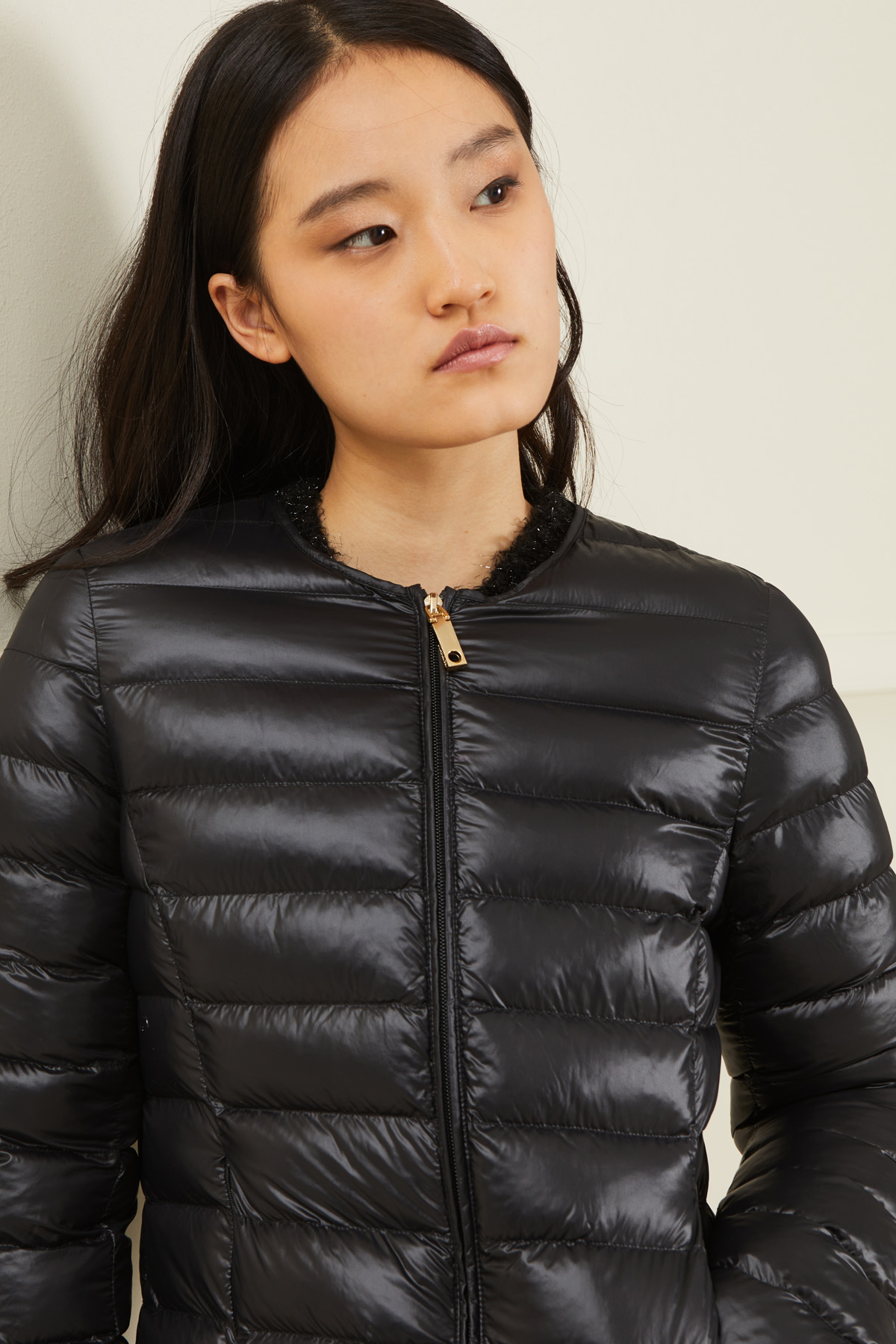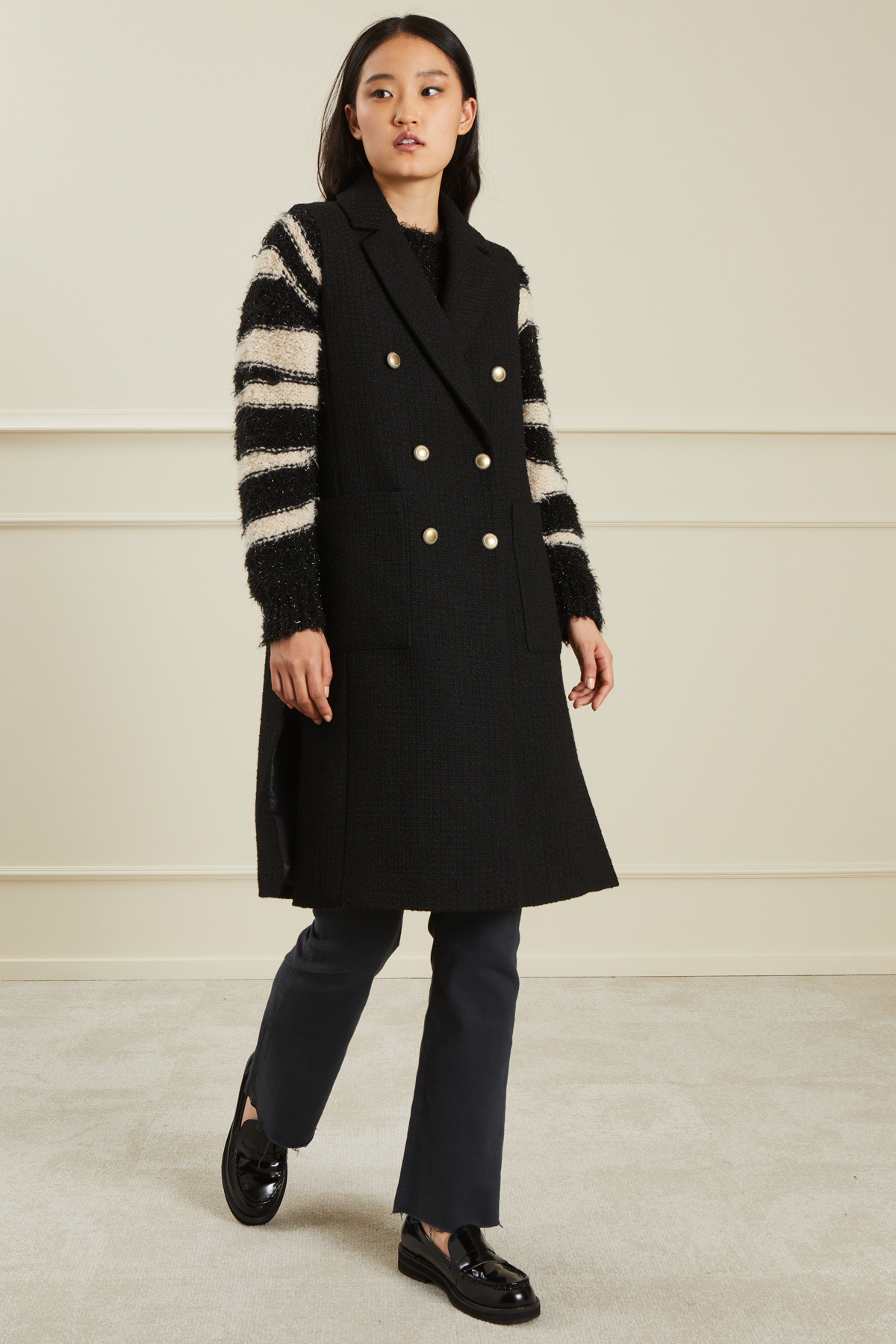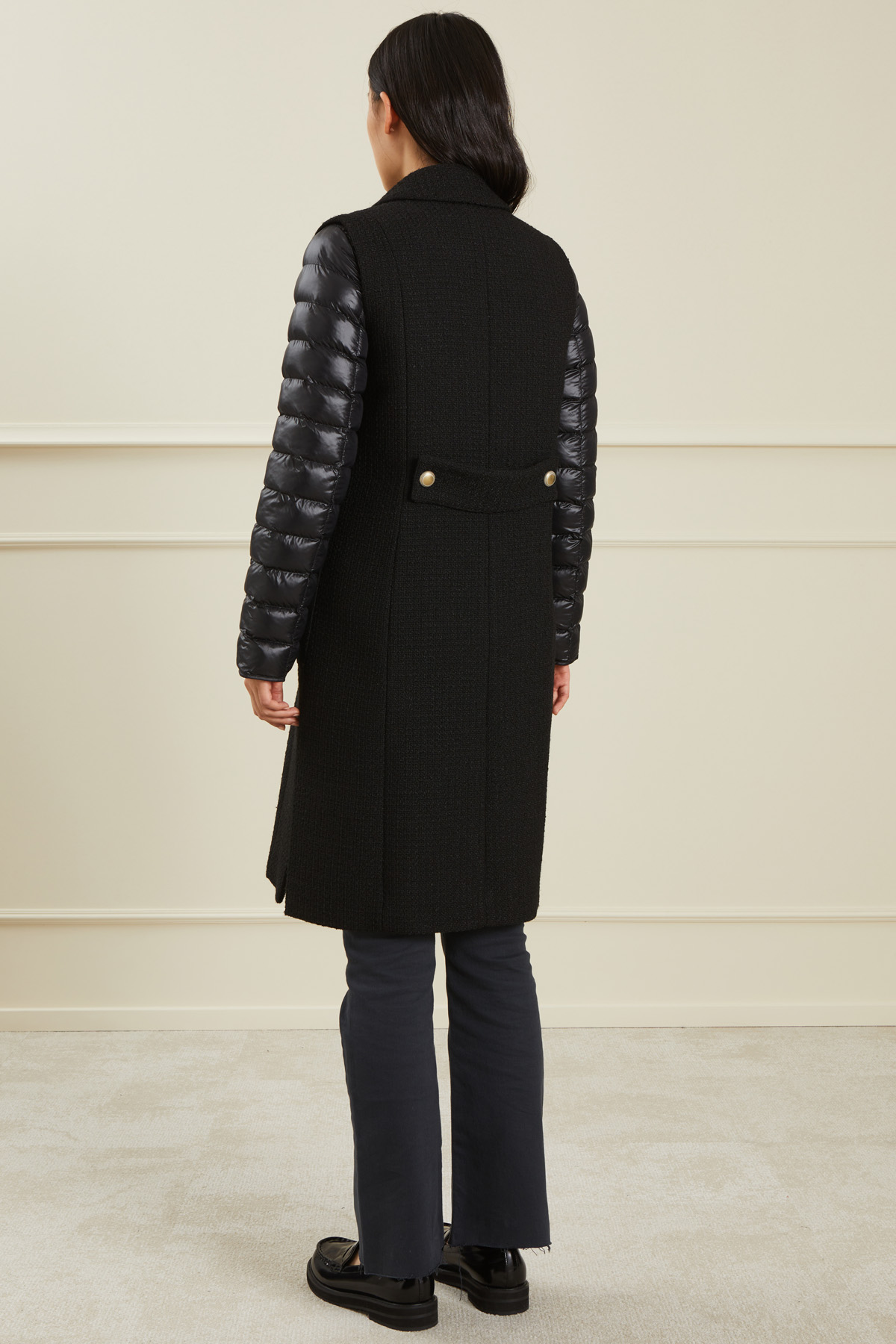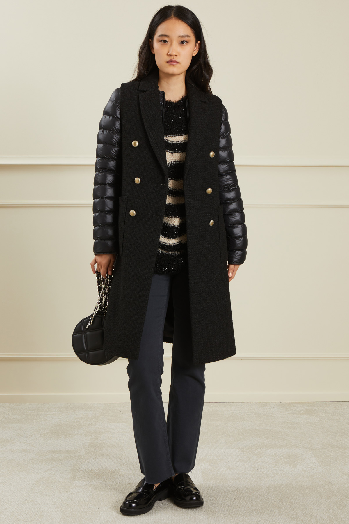 Giaccone scomponibile a due pezzi dalla linea dritta. Gilet realizzato in tessuto armaturato di misto viscosa con collo a rever, tasche laterali applicate, alamaro nel retro, spacchi a fondo capo e allacciatura doppiopetto tramite bottoni. Imbottito realizzato in raso tecnico trapuntato, con scollo a giro, tasche inserite in cucitura con zip e allacciatura tramite cerniera.