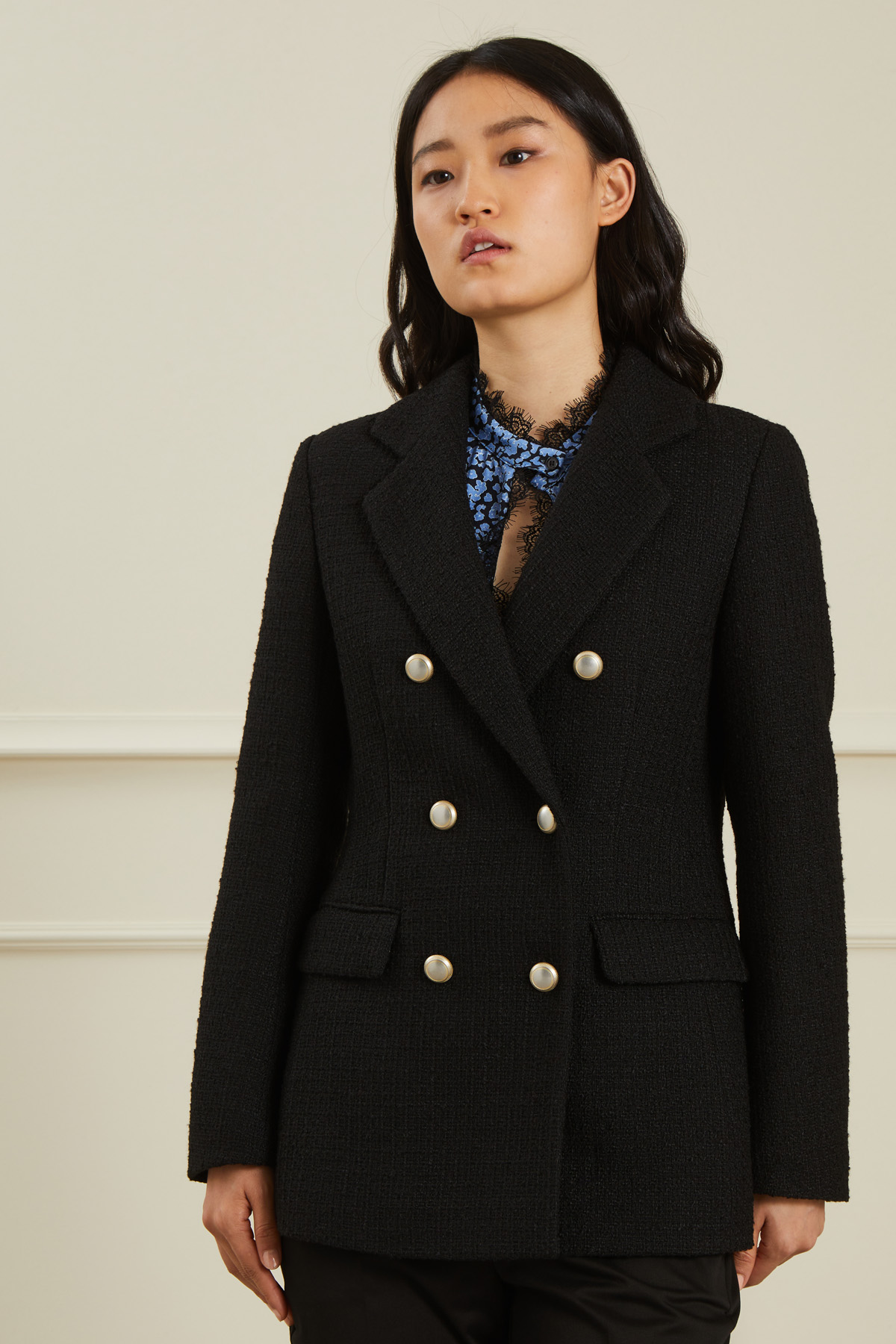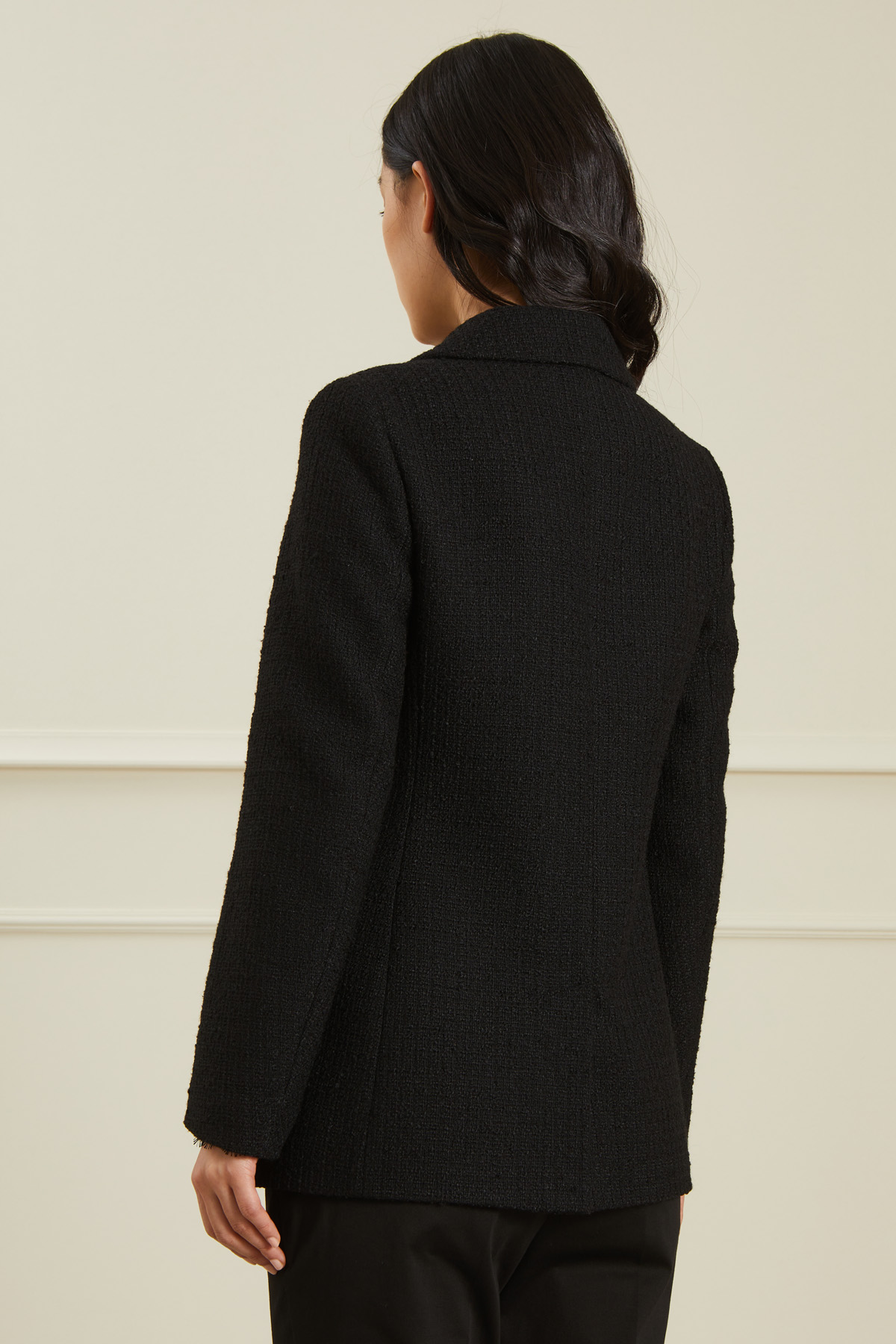 Caban dalla linea sfiancata realizzato in tela bouclè, con collo a rever, tasche a filetto con patta, spacco centrale al fondo dietro e chiusura doppio petto a bottoni. Capo foderato.