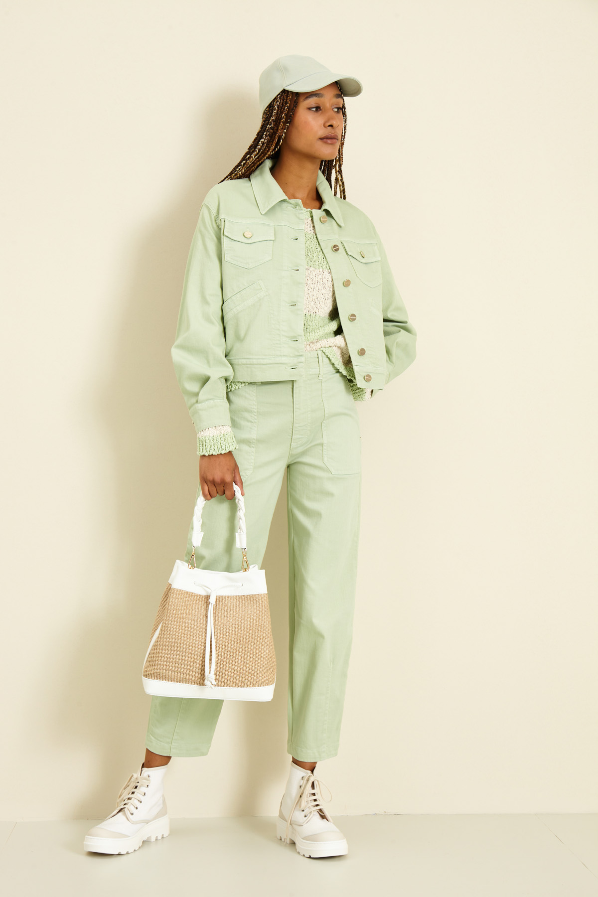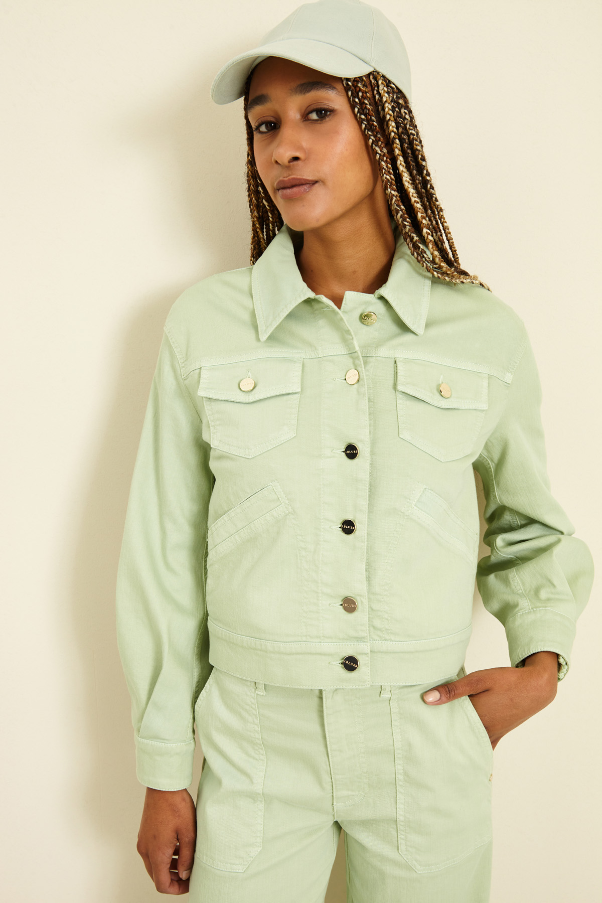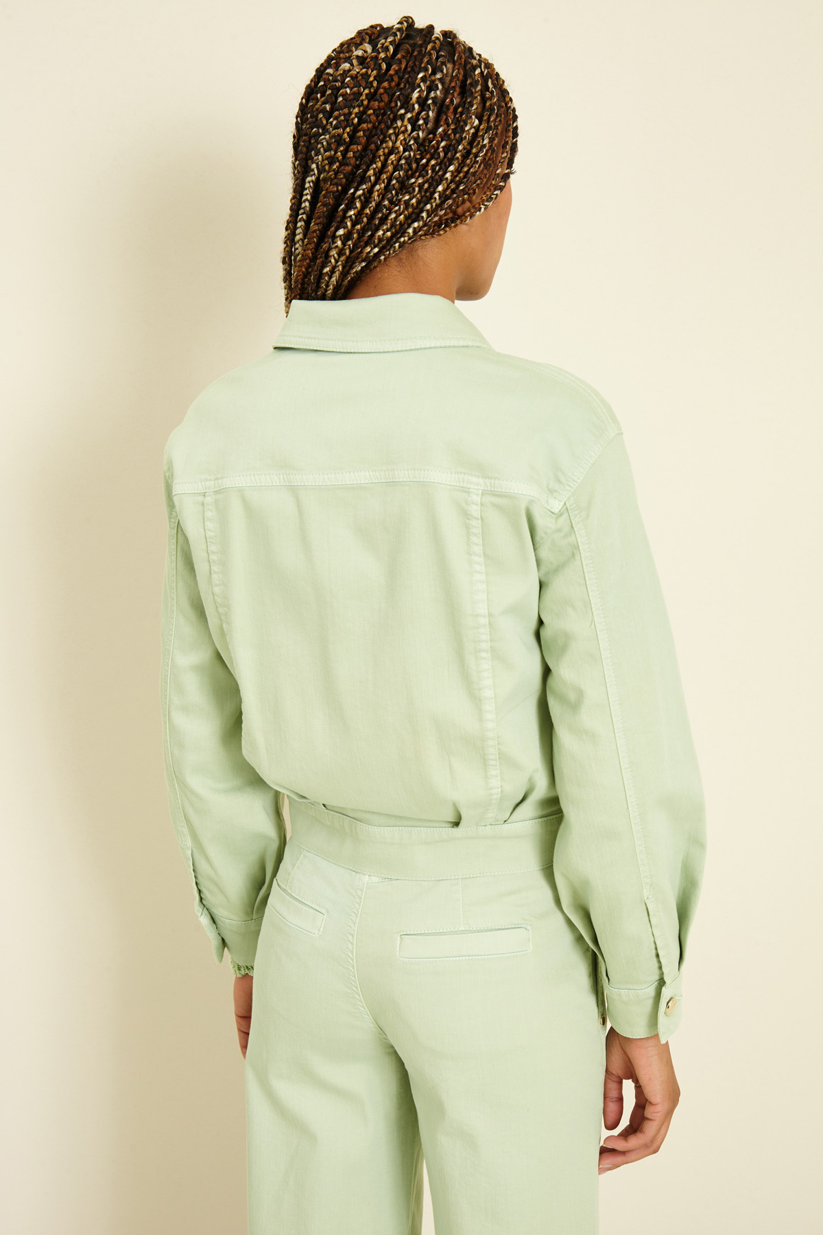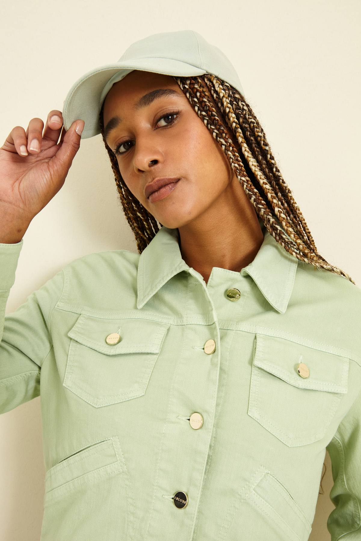 Giacca corta dalla linea boxy realizzata in bull di misto cotone, con colletto a camicia, maniche lunghe con polsino e bottone, taschini a filetto e applicati con patta sul davanti. Allacciatura tramite bottoni a vista.