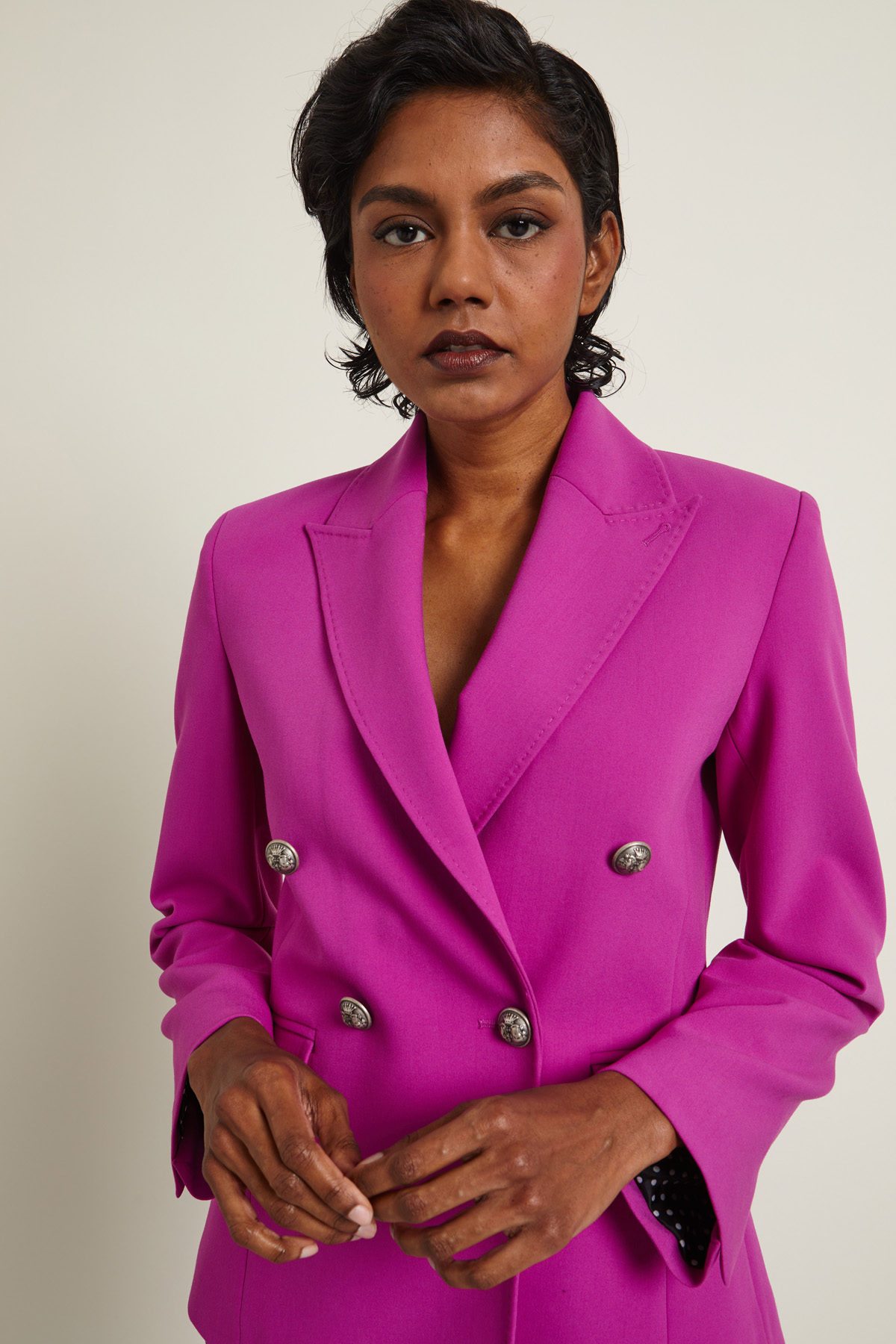 Blazer dalla linea dritta realizzato in tela spessa stretch con collo a rever, maniche lunghe con spacchetto al fondo, tasche a doppio filetto con patta e spacco nel retro. Allacciatura a doppiopetto tramite bottoni in metallo. Capo foderato.