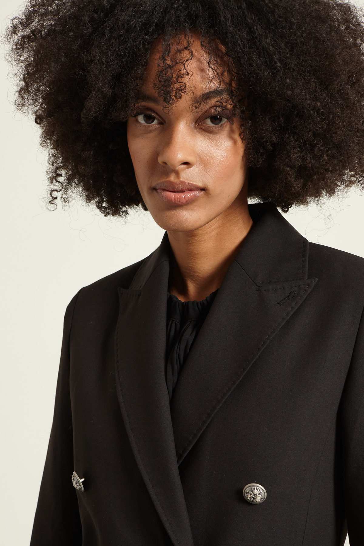 Blazer dalla linea dritta realizzato in tela spessa stretch con collo a rever, maniche lunghe con spacchetto al fondo, tasche a doppio filetto con patta e spacco nel retro. Allacciatura a doppiopetto tramite bottoni in metallo. Capo foderato.
