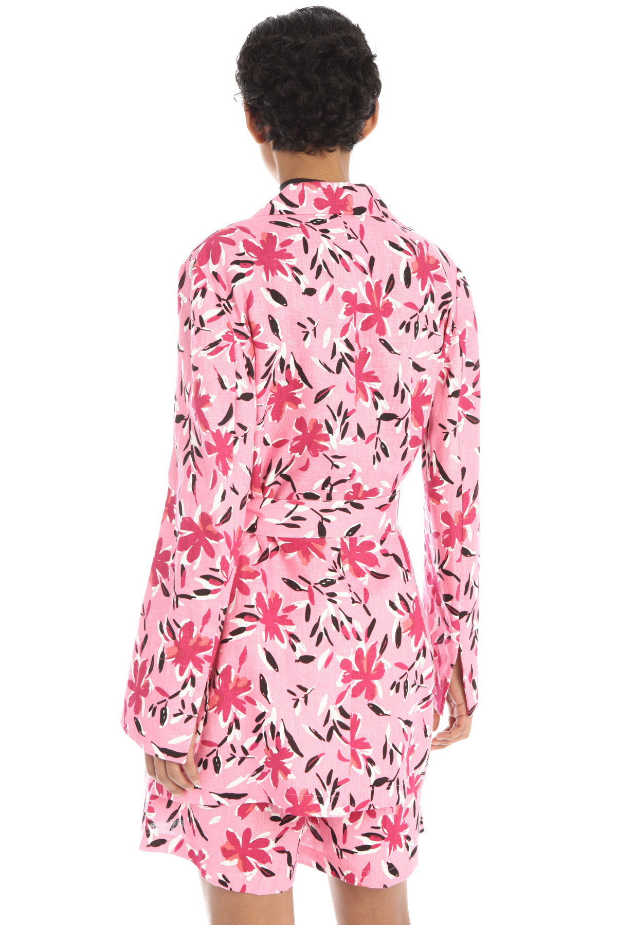 Blazer dalla linea sfiancata realizzato in tela di puro lino, con collo a rever, maniche lunghe, tasche applicate, spacco nel retro e allacciatura tramite cintura coordinata. Sfoderato.