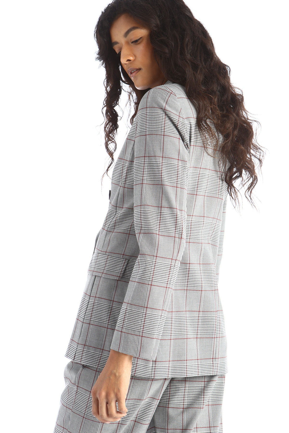 Blazer dalla linea dritta realizzato in tela di misto viscosa tinto filo, con collo a rever, maniche lunghe, tasche laterali con patta e allacciatura doppiopetto tramite bottoni. Capo foderato.