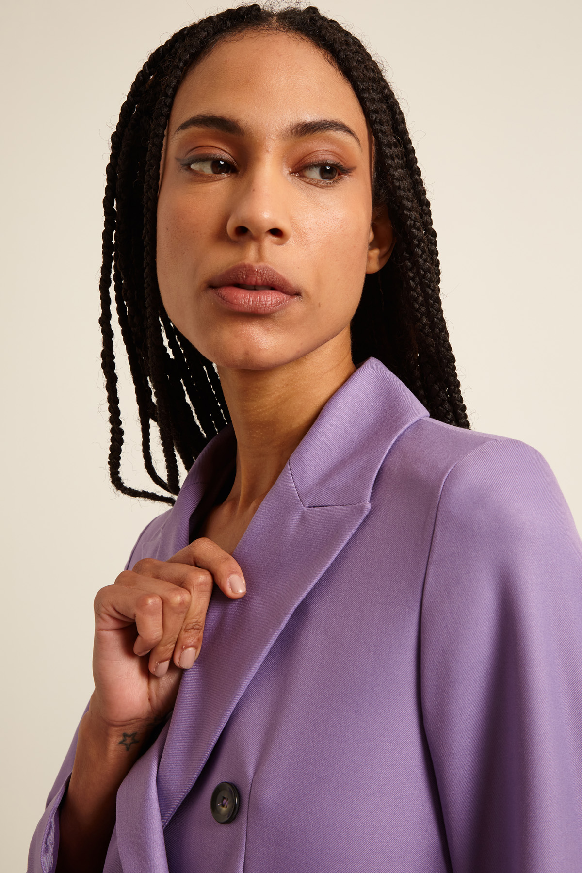 Blazer dalla linea dritta realizzato in batavia di misto viscosa stretch con collo rever, maniche lunghe e tasche doppio filetto con patta. Allacciatura doppiopetto tramite bottoni a vista. Foderato.