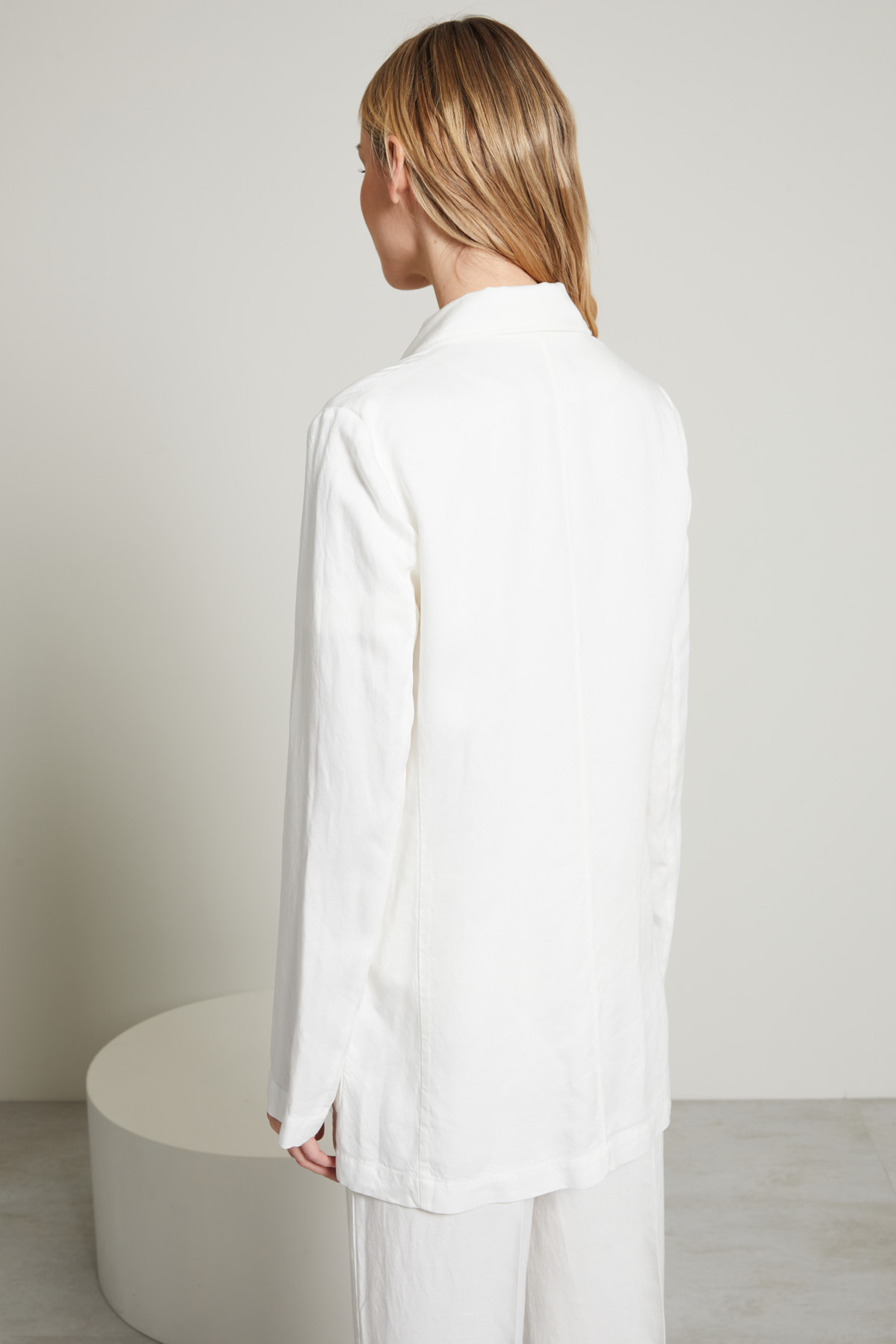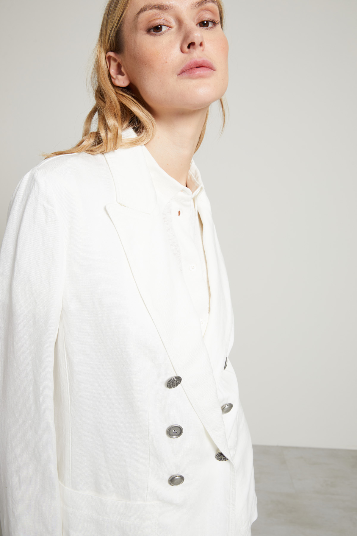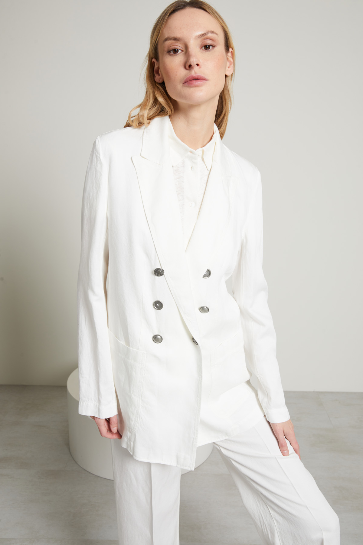 Blazer destrutturato realizzato in tessuto armaturato di fibra naturale e lino, con collo a rever, maniche lunghe, tasche applicate e allacciatura doppiopetto tramite bottoni metallici. Capo sfoderato.