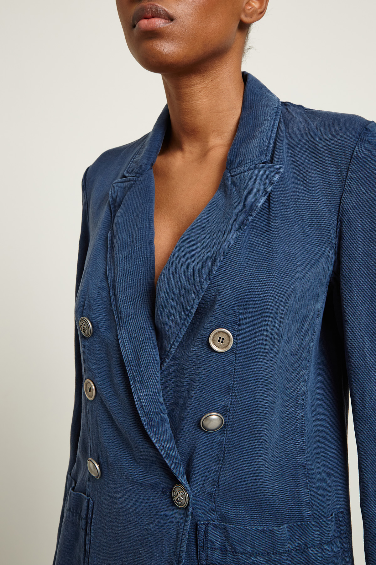 Blazer destrutturato realizzato in tessuto armaturato di fibra naturale e lino, con collo a rever, maniche lunghe, tasche applicate e allacciatura doppiopetto tramite bottoni metallici. Capo sfoderato.