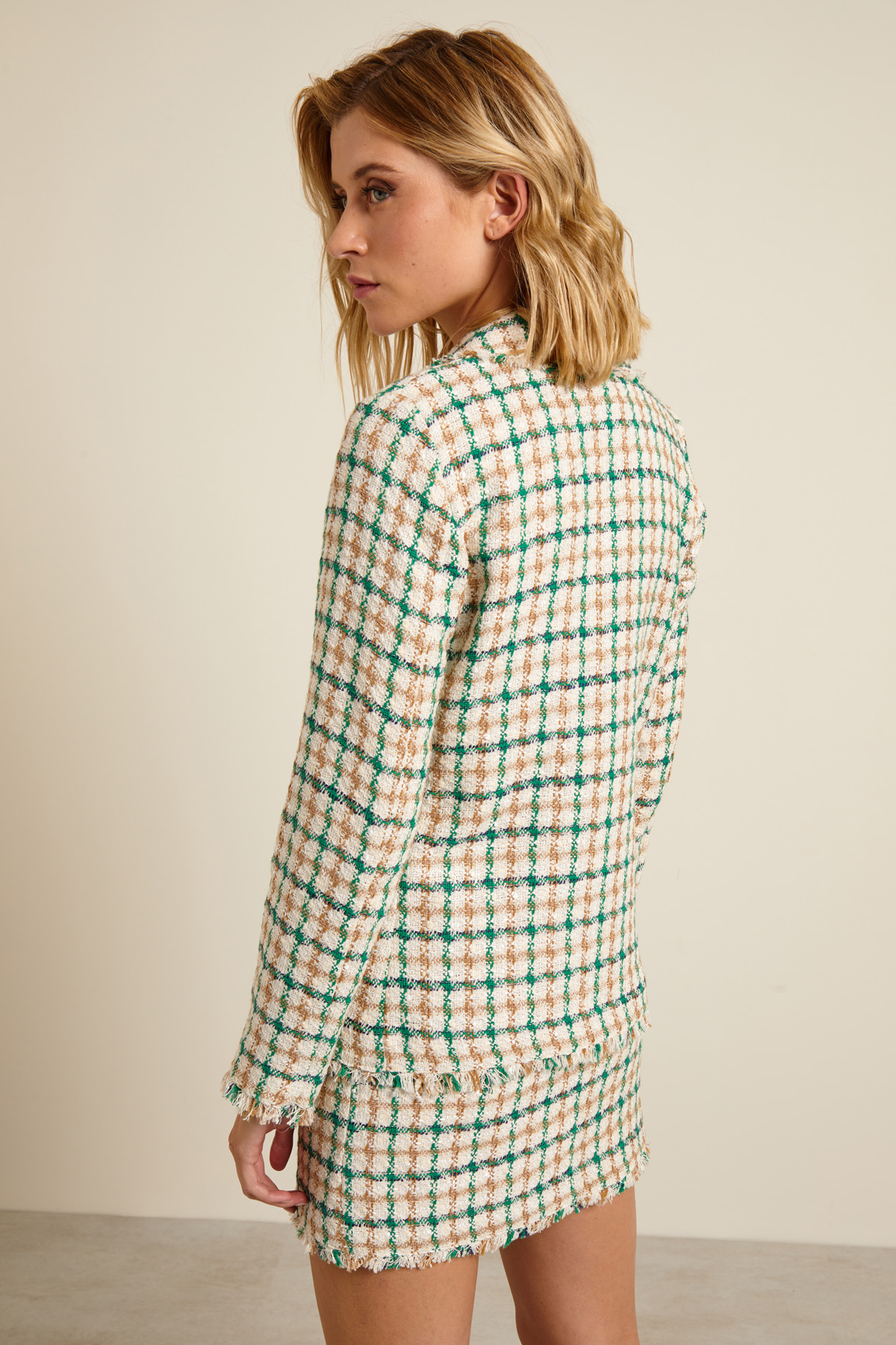 Blazer dalla linea dritta realizzato in tweed di misto cotone tinto filo con inserti in filato lamè, collo a rever, maniche lunghe, tasche a filetto con patta sul davanti e profili sfrangiati. Allacciatura monopetto tramite bottoni rivestiti.