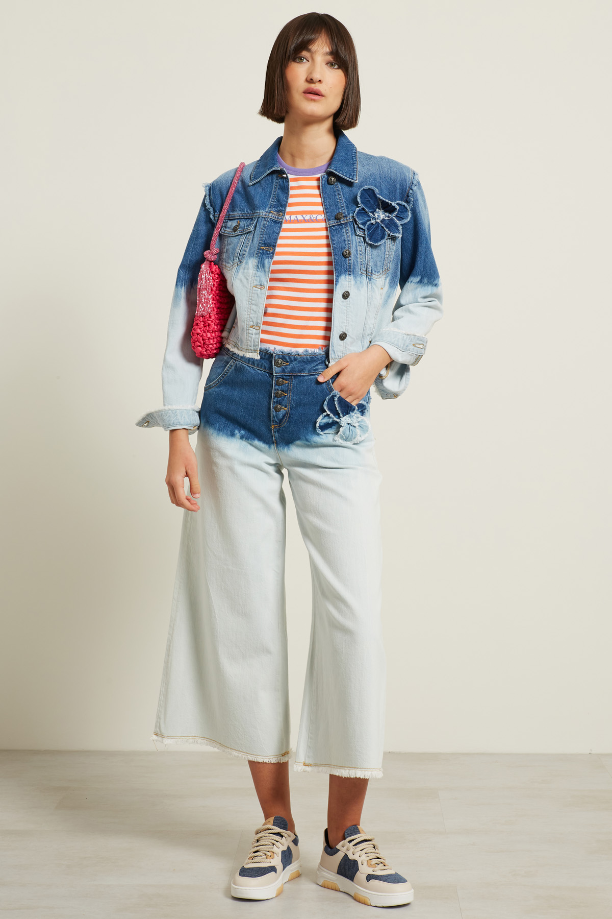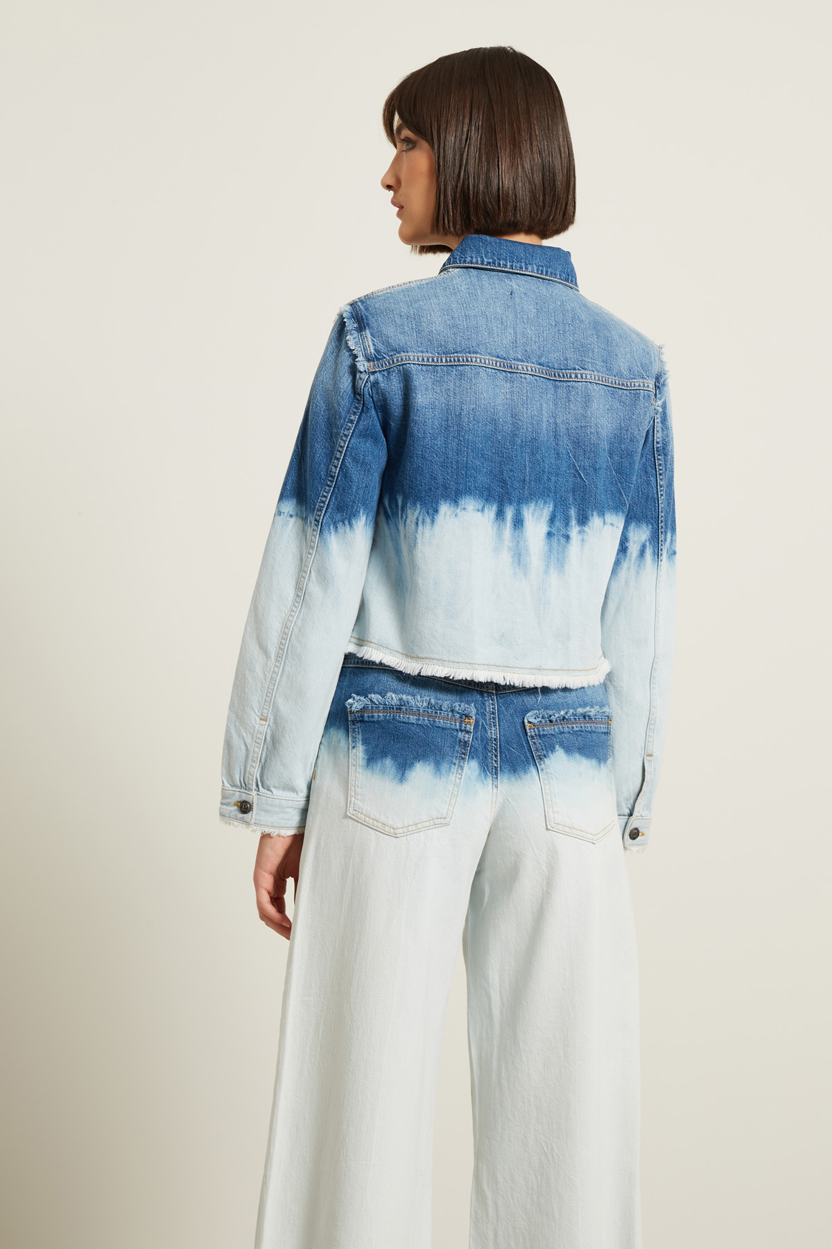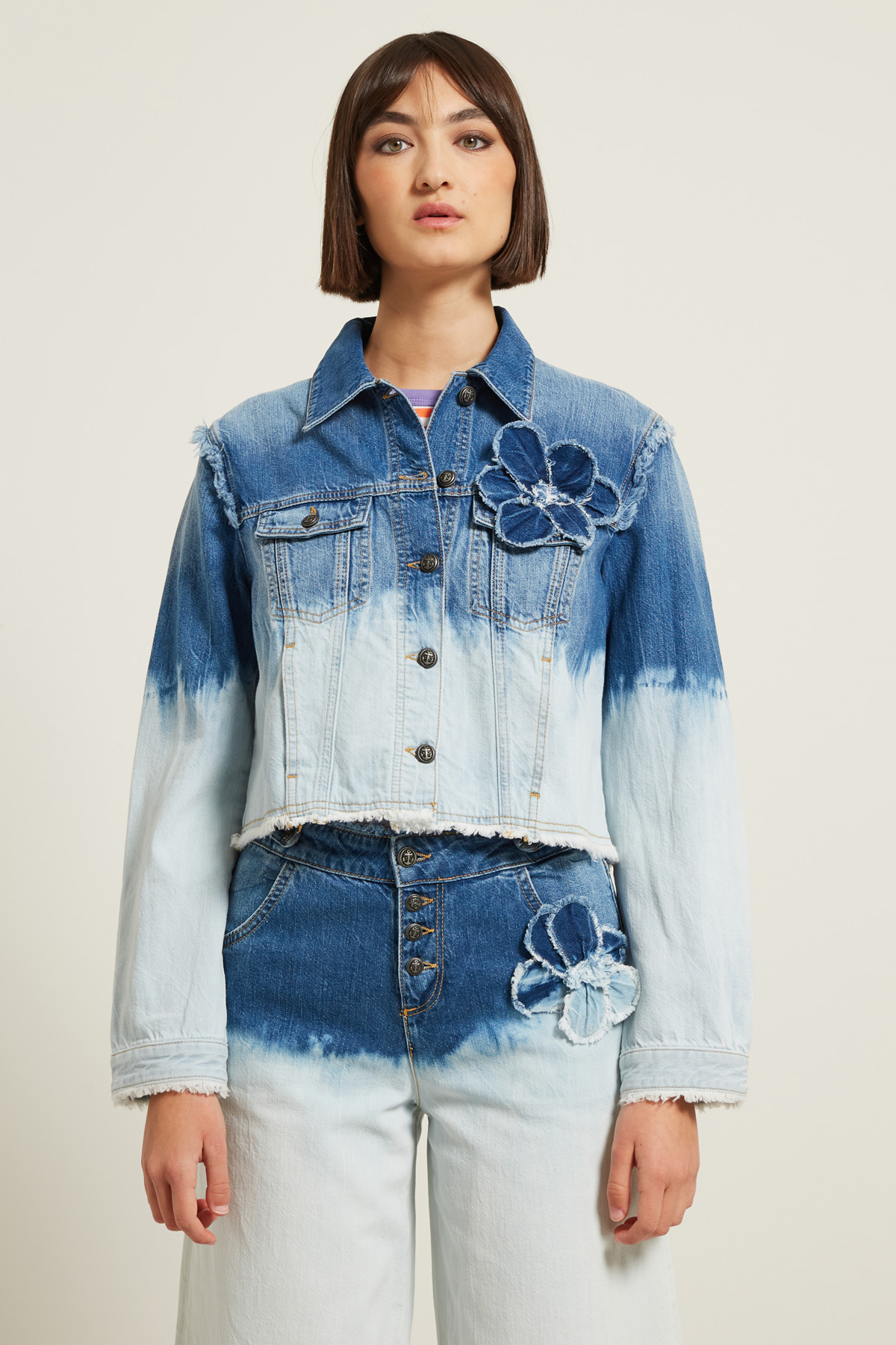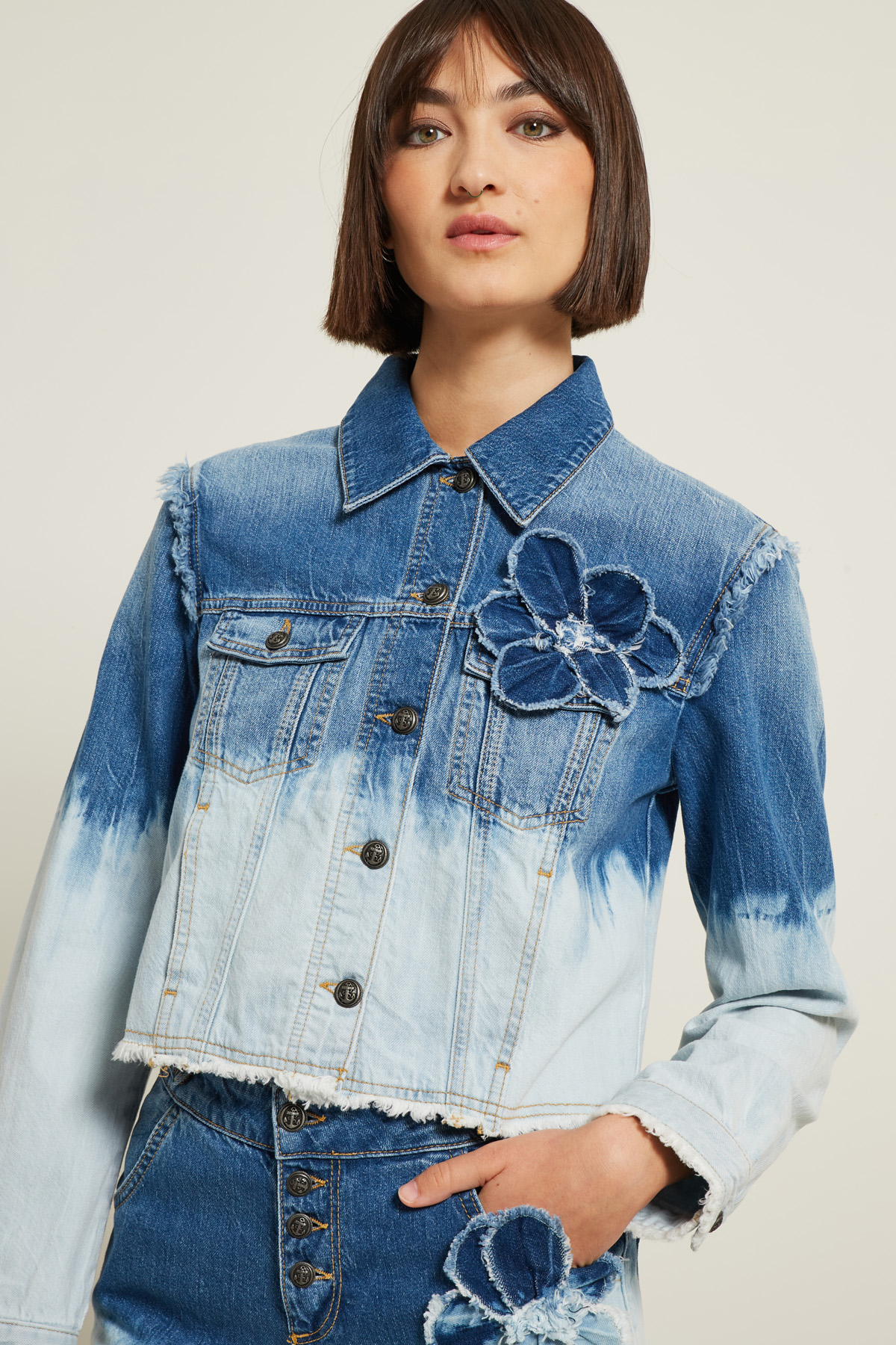 Giacca corta dalla linea dritta realizzata in denim di puro cotone stampato, con dettaglio a rilievo, colletto classico, maniche lunghe con polsino e bottone, taschini applicati con patta e profili sfrangiati. Allacciatura monopetto tramite bottoni. Sfoderata.
