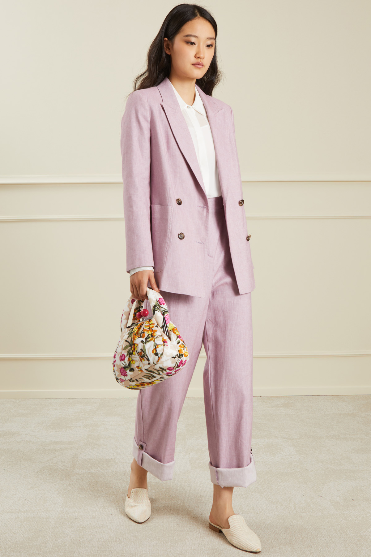 Blazer dalla linea dritta realizzato in tela doppia di misto lino e cotone stretch, con collo a rever, maniche lunghe con spacchetto, tasche applicate sui fianchi, spacco sul retro a fondo capo, profili rifiniti a puntino e allacciatura doppiopetto tramite bottoni. Foderato.