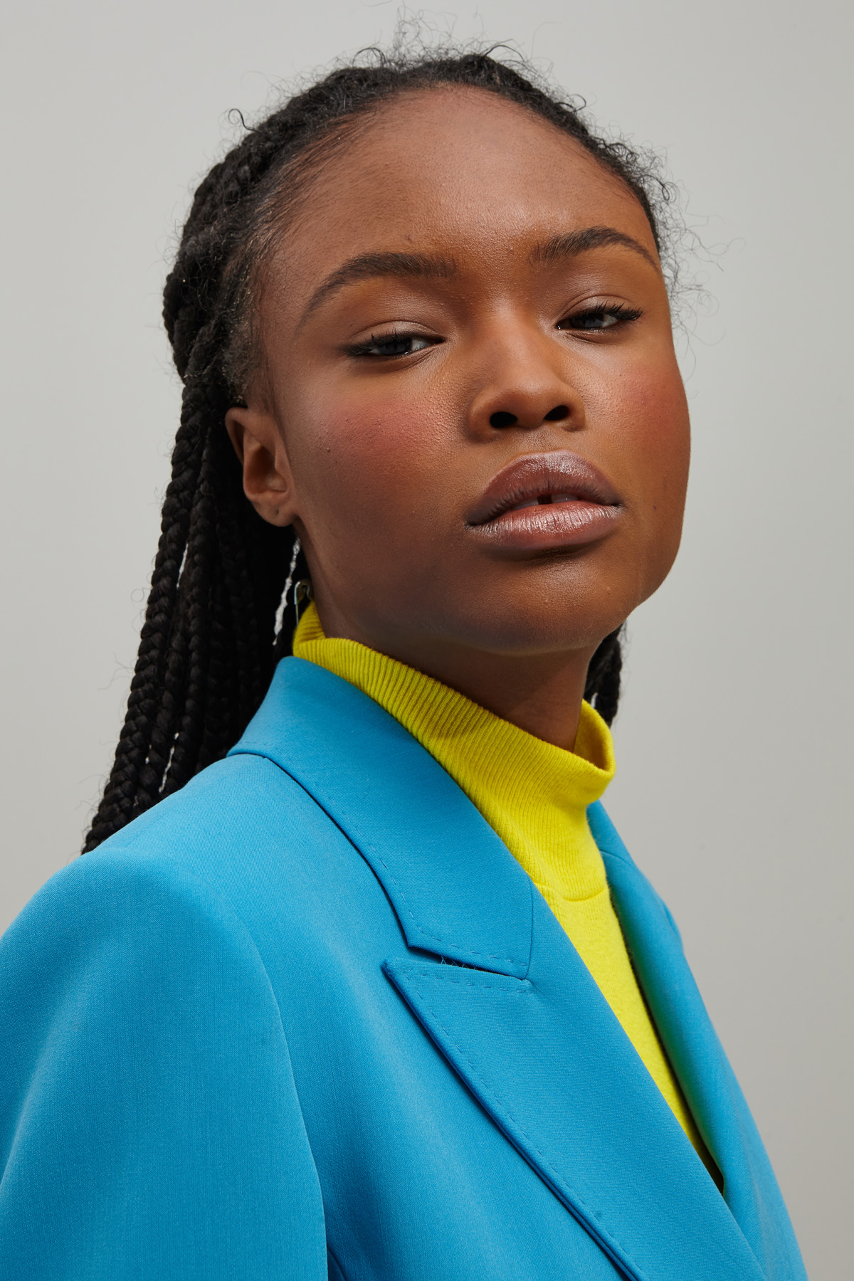 - Tessuto 71% poliestere, 22% viscosa, 7% elastan; fodera fusto 52% poliestere, 48% elastomultiestere; fodera maniche 68% acetato, 32% poliestere.