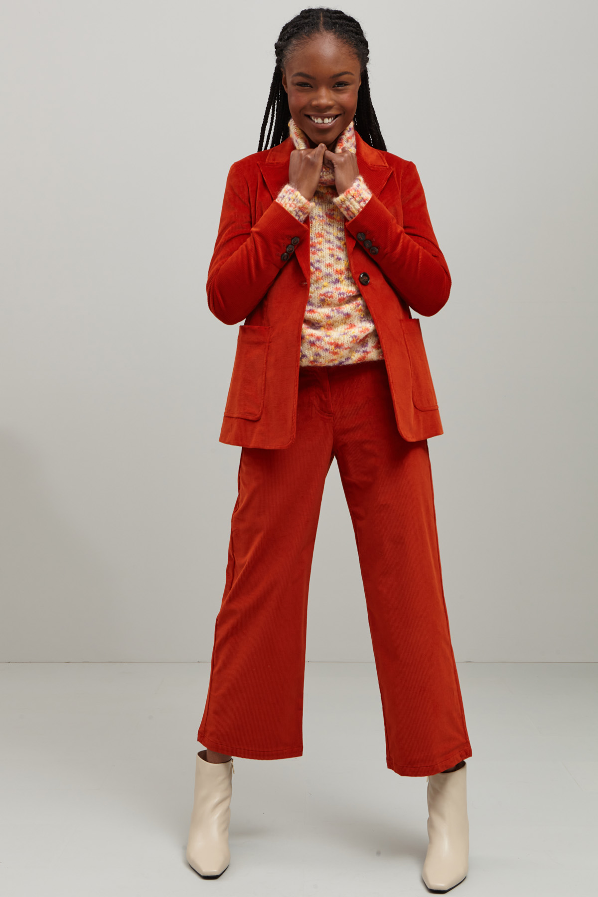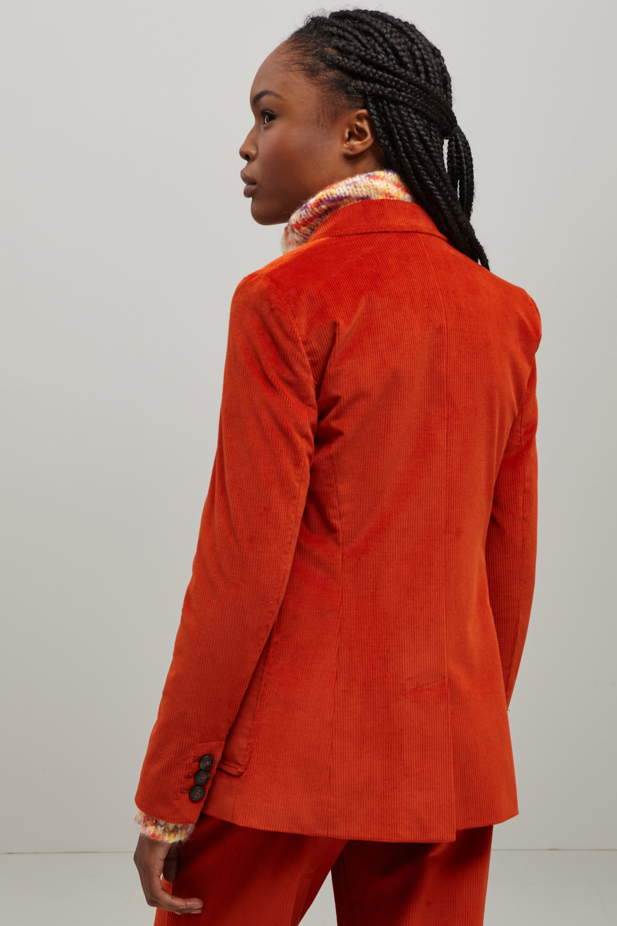 Blazer dalla linea dritta realizzato in velluto di cotone stretch lavorato a coste con collo a rever, maniche lunghe con bottoni al fondo e tasche applicate. Allacciatura monopetto tramite bottone a vista. Capo foderato.