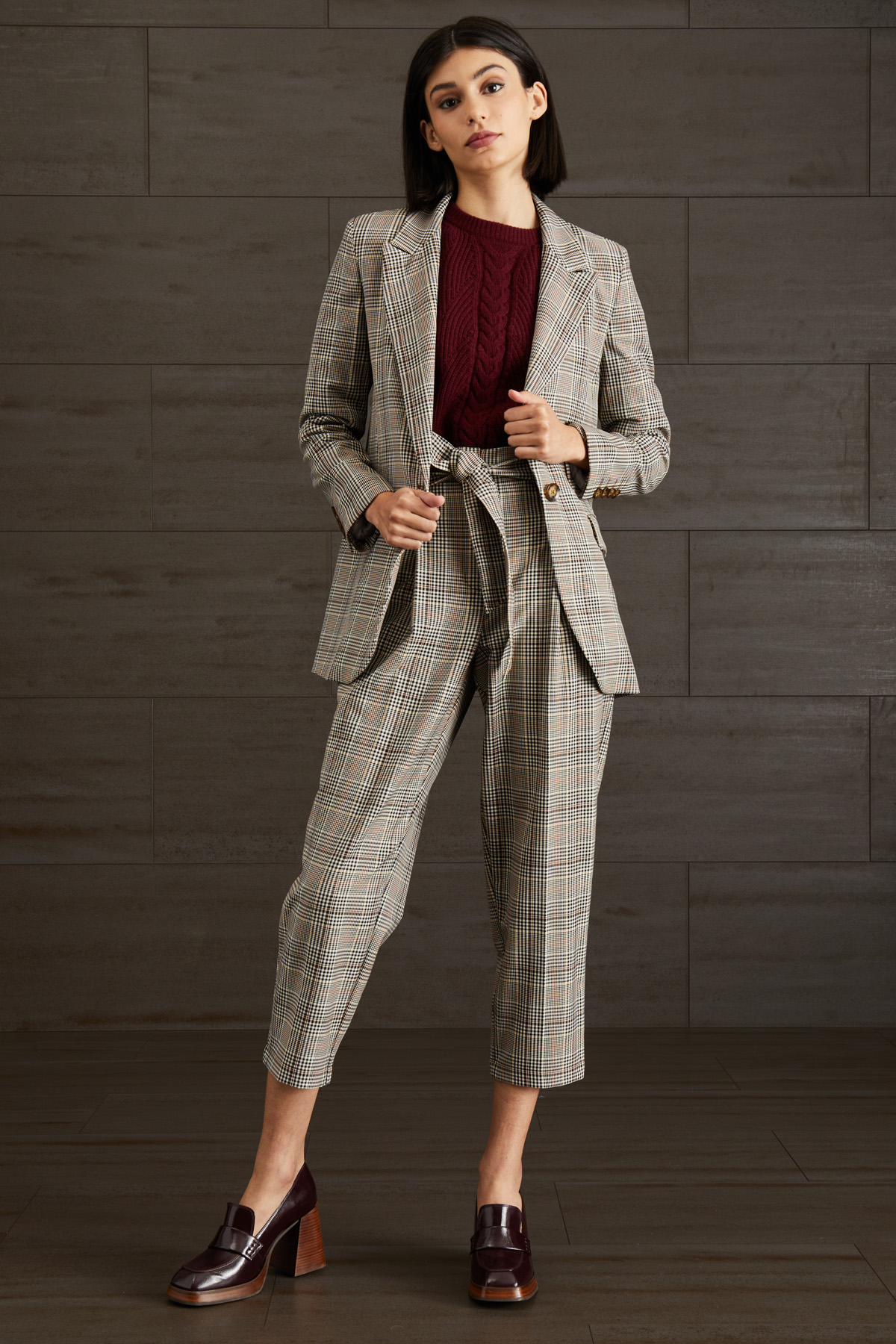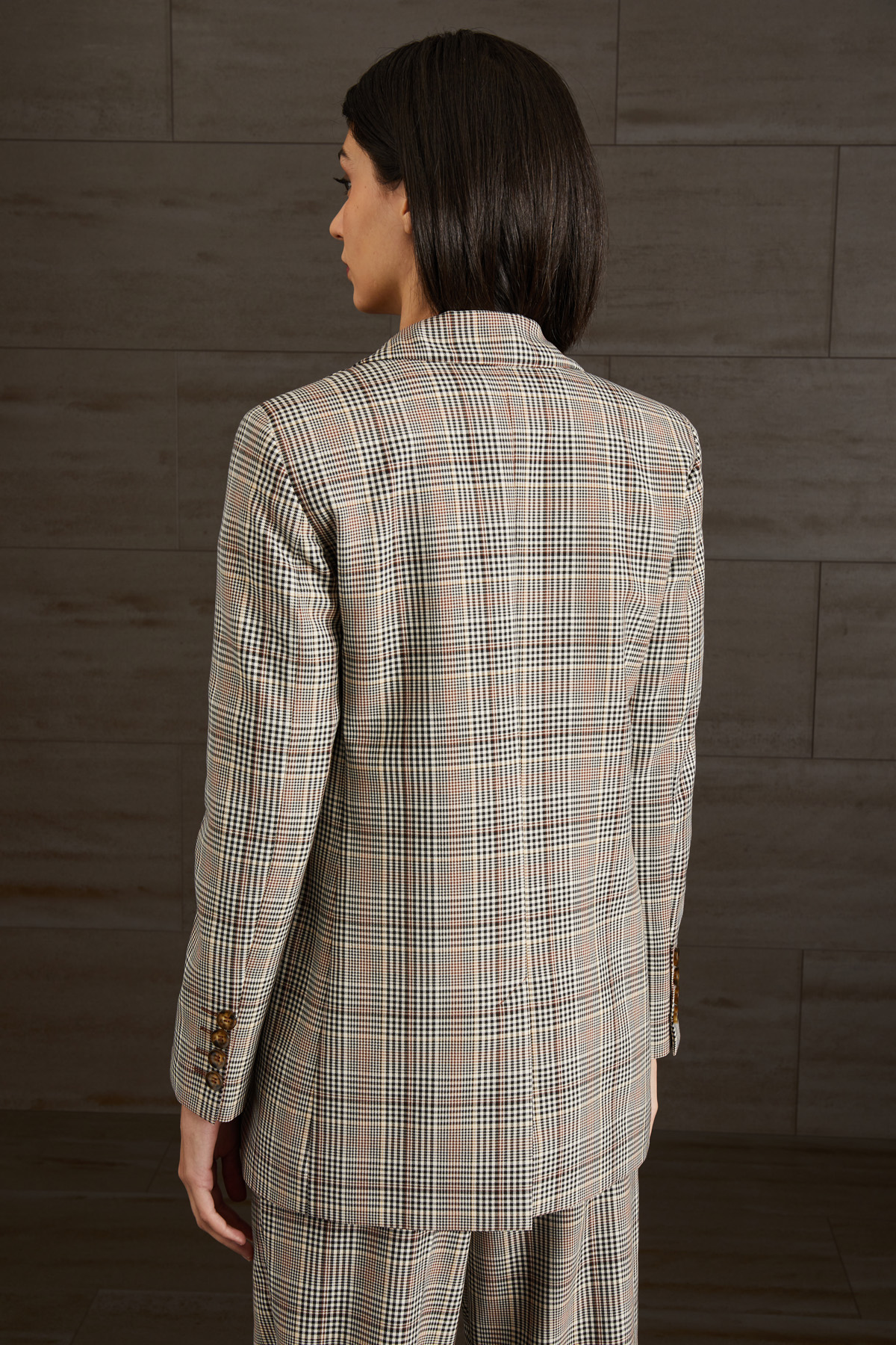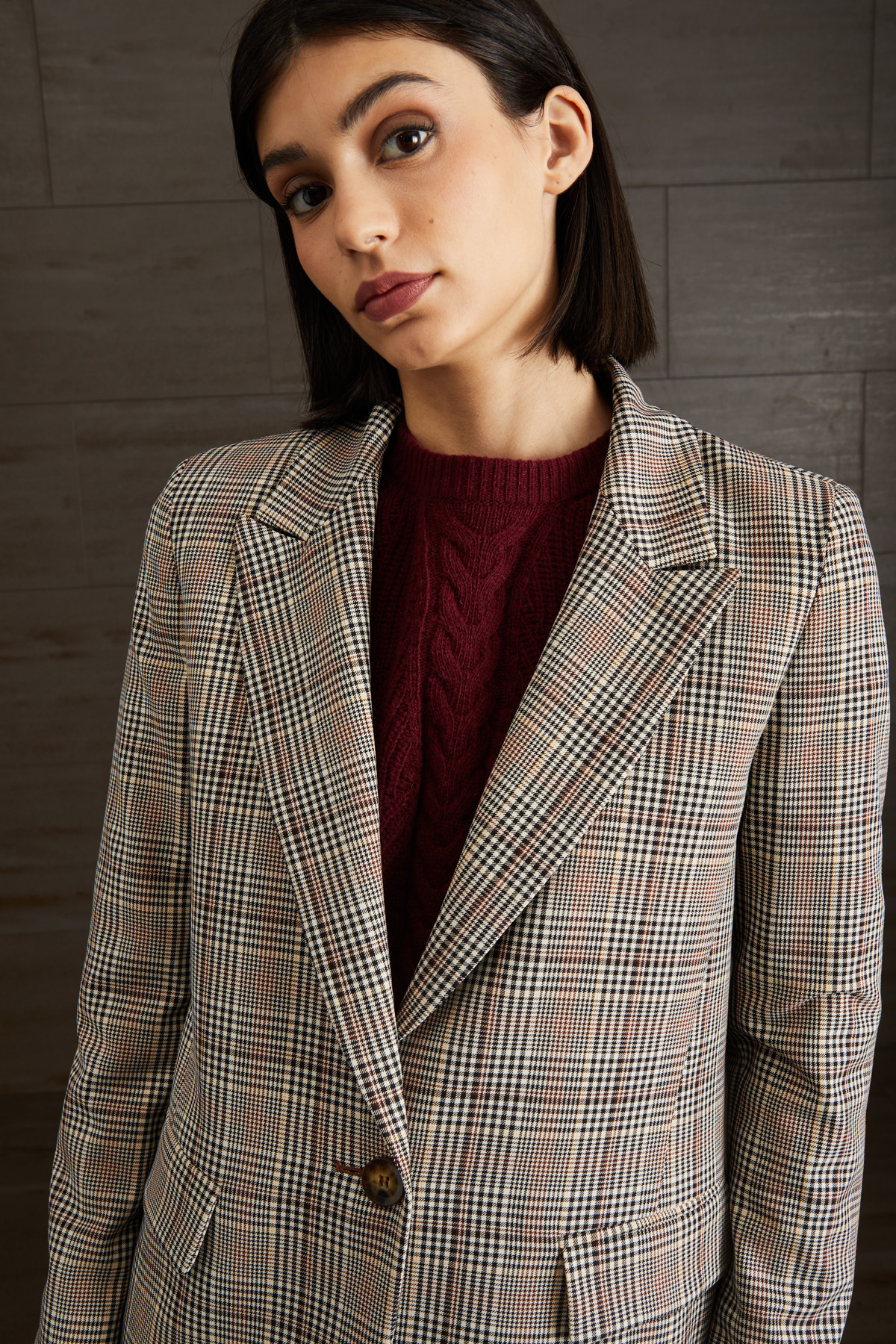 Blazer dalla linea dritta realizzato in tessuto di misto viscosa stretch tinto filo, con collo a rever, maniche lunghe con spacchetti e bottoni al fondo, tasche a filetto con patta e spacco nel retro. Allacciatura monopetto tramite bottone.