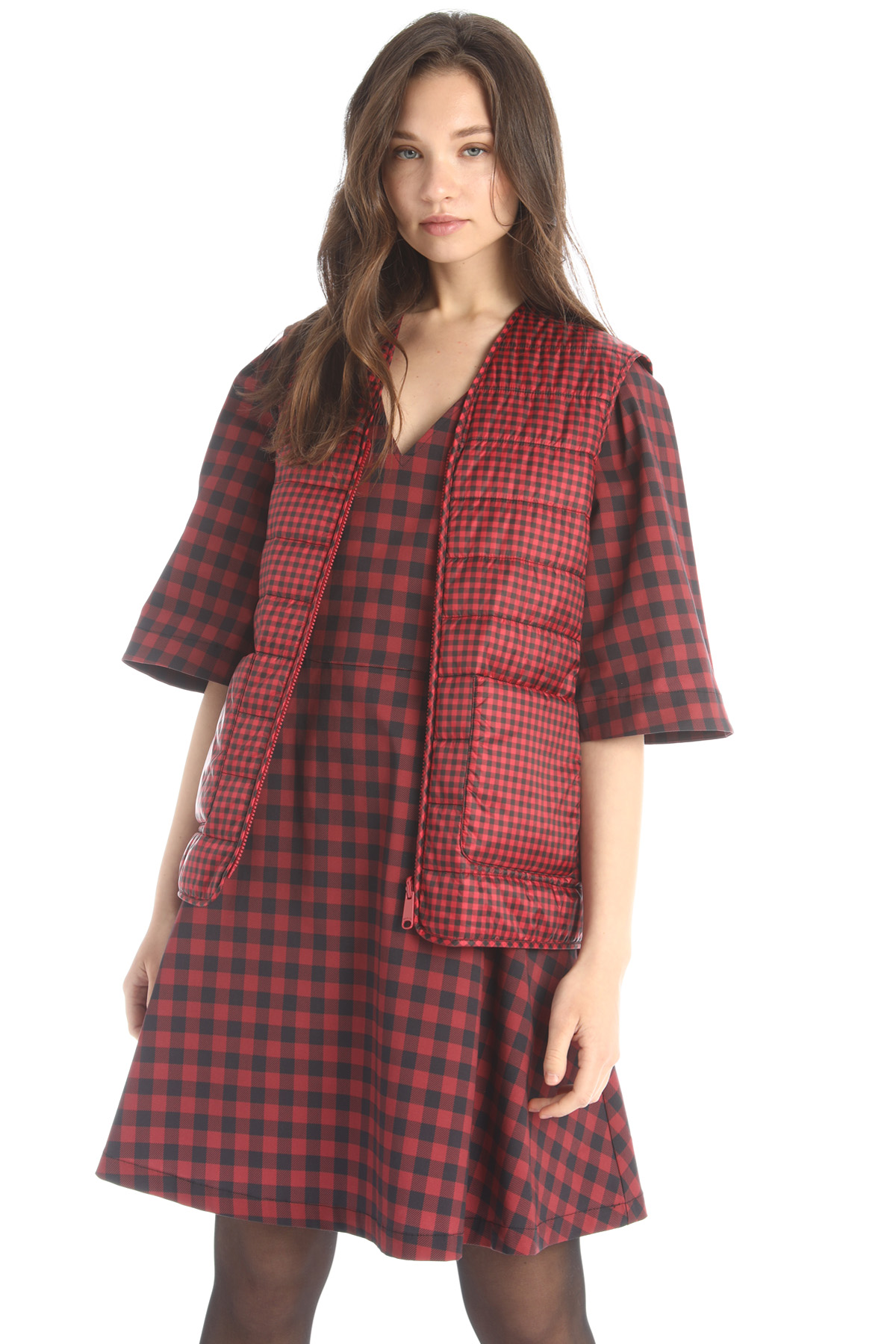 Impermeabile due pezzi dalla linea dritta. Giacca realizzata in tessuto tecnico di cotone antigoccia con colletto a camicia, maniche lunghe, tasche laterali inserite in cucitura con patta e allacciatura tramite zip e bottoni. Gilet realizzato in tessuto tecnico stampato con tasche applicate e zip.