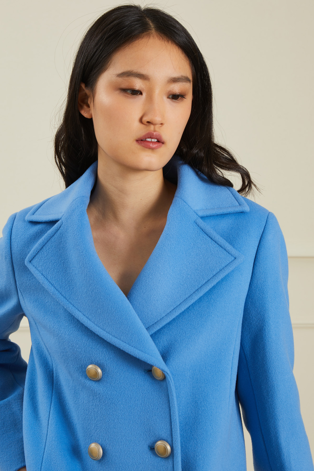 Caban dalla linea dritta realizzato in drap di pura lana vergine, con collo a rever, tasche applicate con patta e chiusura doppiopetto a bottoni. Capo foderato.