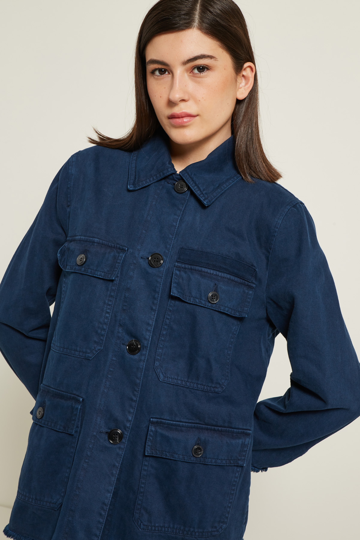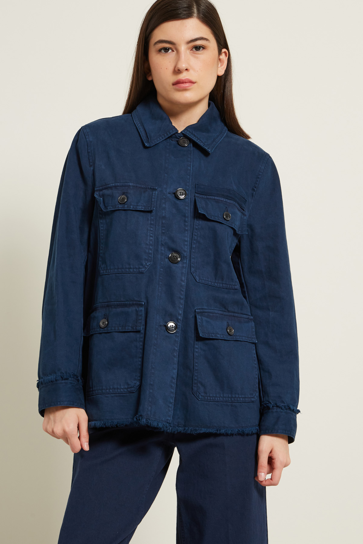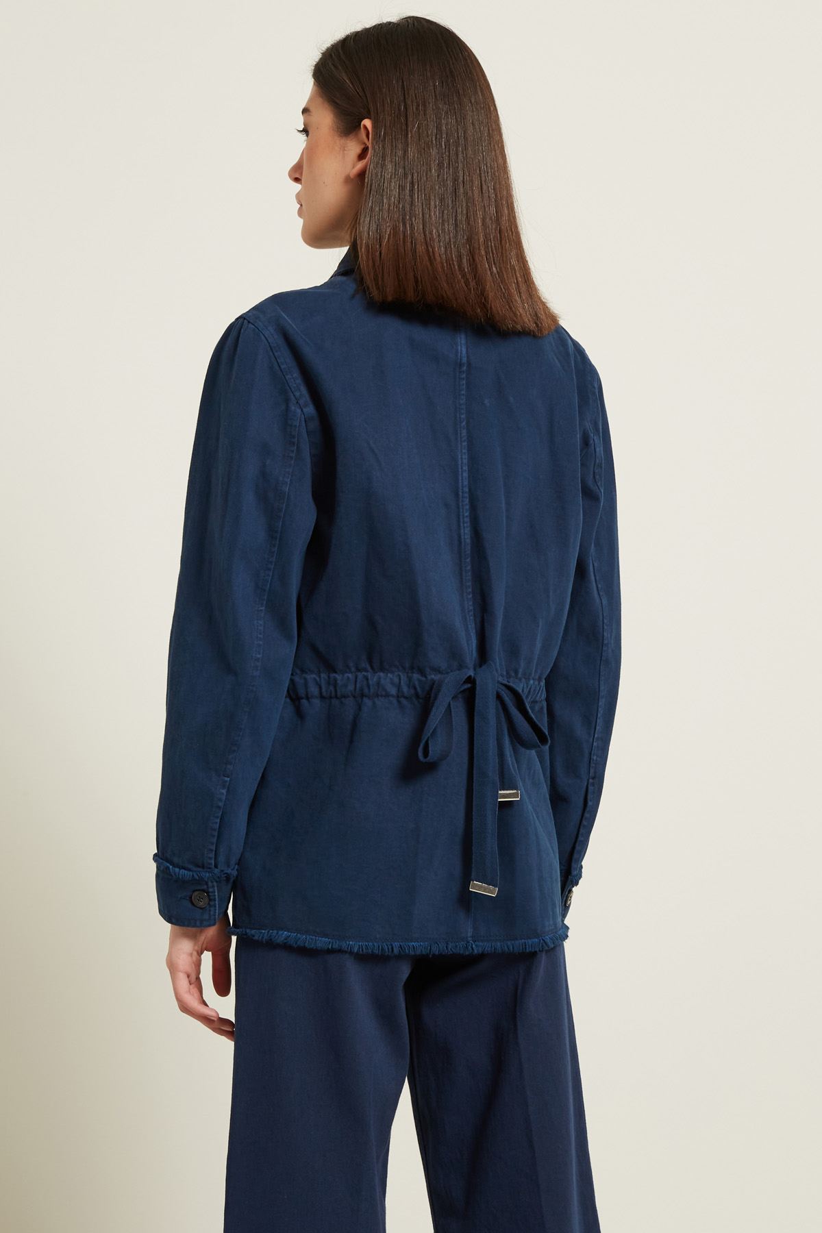Giacca dalla linea dritta realizzata in drill di puro cotone, con colletto a camicia, motivo sfrangiato ai bordi, maniche lunghe con polsino e bottone. Tasche e taschini applicati con patta sul davanti e coulisse nel retro. Allacciatura monopetto tramite bottoni. Sfoderata.