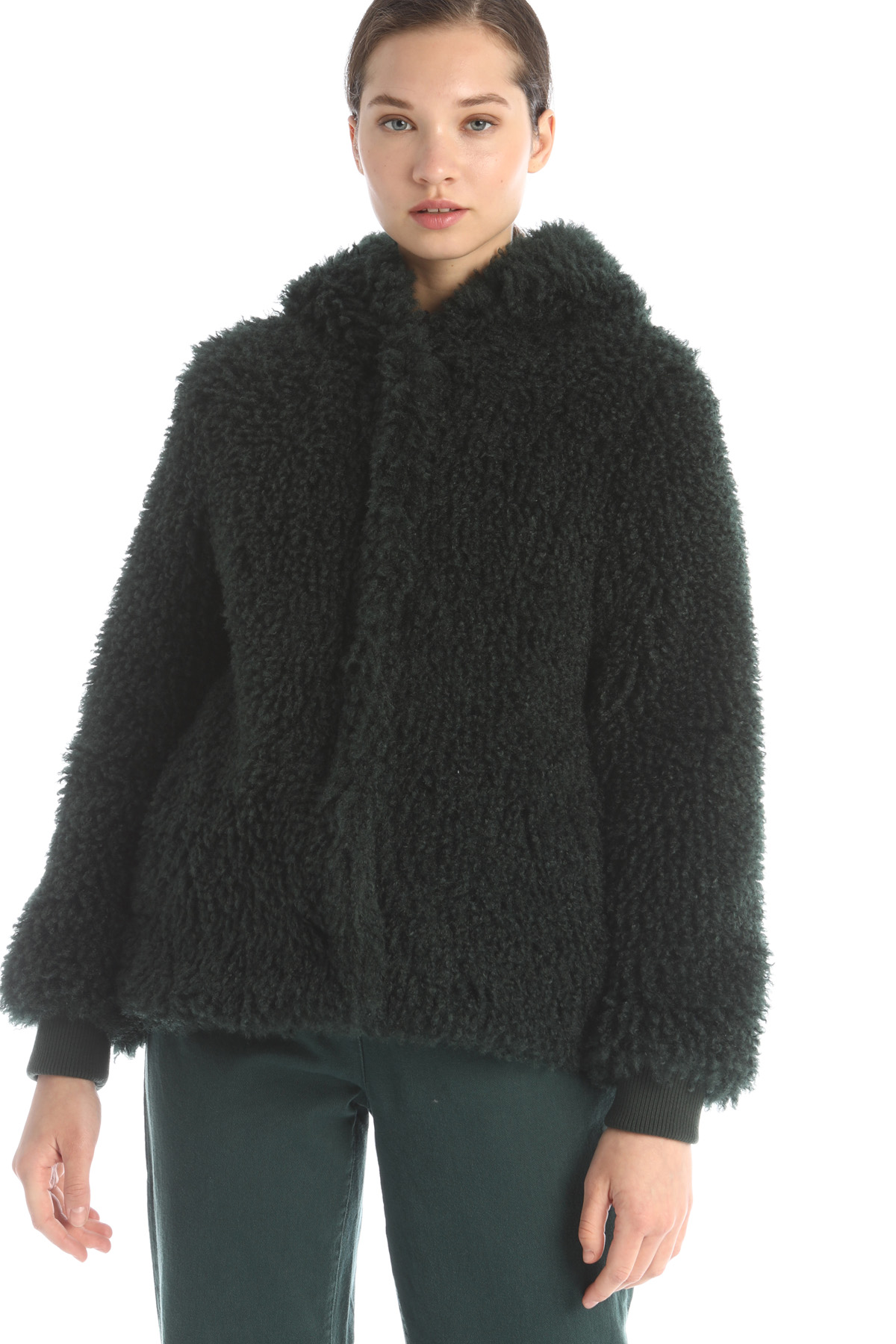 Cappotto dalla linea dritta realizzato in tessuto effetto peluche, con cappuccio,maniche lunghe con polsino in maglia, tasche laterali inserite in cucitura e allacciatura nascosta tramite bottoni automatici. Capo foderato.