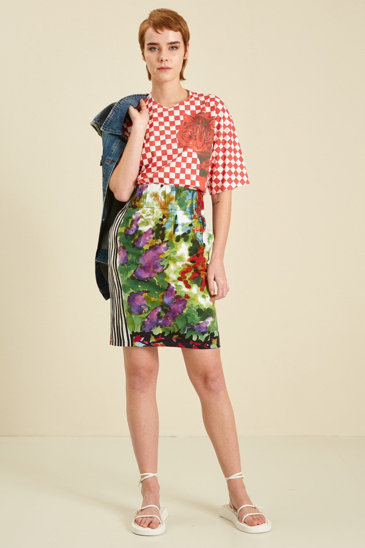 Gonna a tubino realizzata in bull di cotone stretch stampato, con cintone elastico in vita, tasche laterali inserite in cucitura.