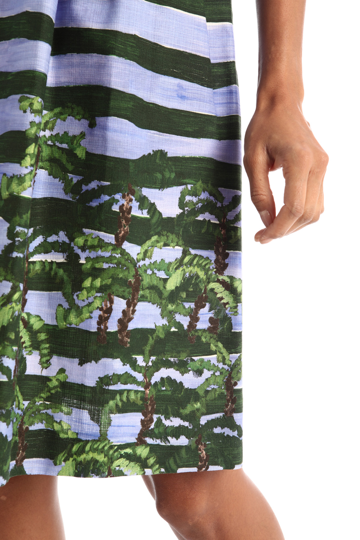 Gonna dalla linea morbida realizzata in stuoia di puro cotone stampata, con cintone, arricciatura in vita e allacciatura tramite zip invisibile e gancio sul fianco.
