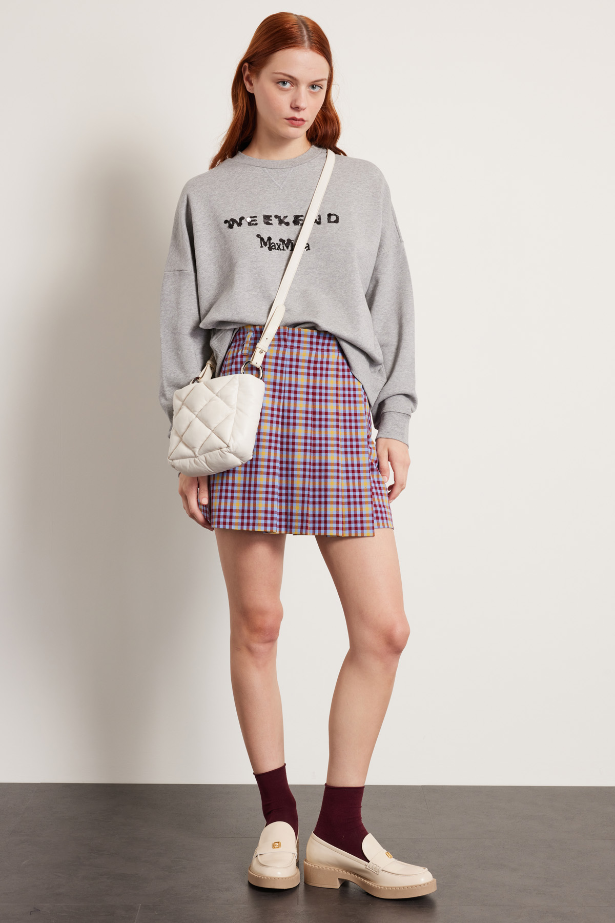 Minigonna a portafoglio dalla linea ad A realizzata in tessuto diagonale di misto viscosa stretch tinto filo, con passanti e pieghe cucite in vita, tasche alla francese e allacciatura tramite bottone a vista.