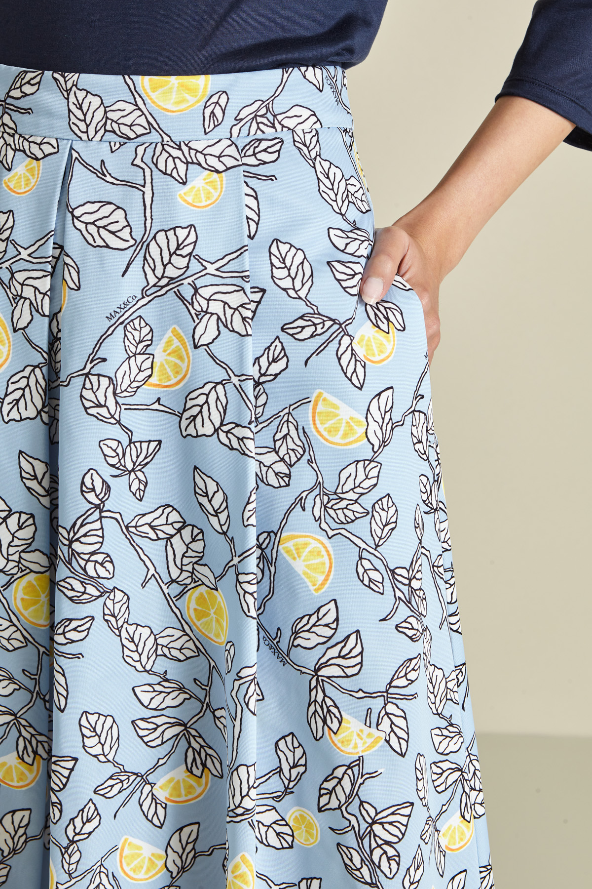 Gonna a pieghe dalla linea svasata realizzata in faille, con cintone in vita, tasche laterali inserite in cucitura e chiusura tramite zip invisibile dietro.