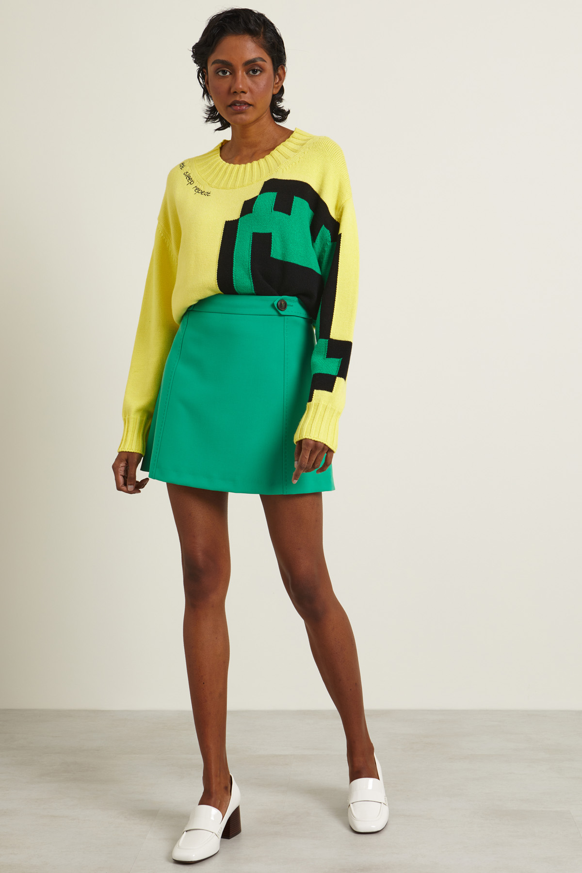 Gonna corta dalla linea ad A realizzata in tessuto di misto viscosa stretch con cintone in vita e dettaglio di alamari e impunture. Allacciatura tramite zip nascosta sul fianco. Capo foderato.