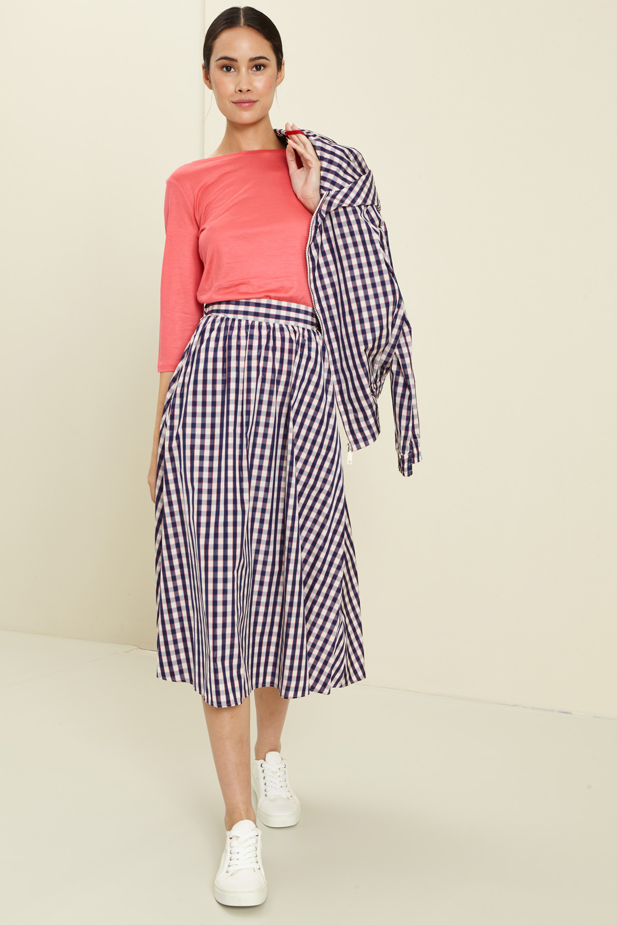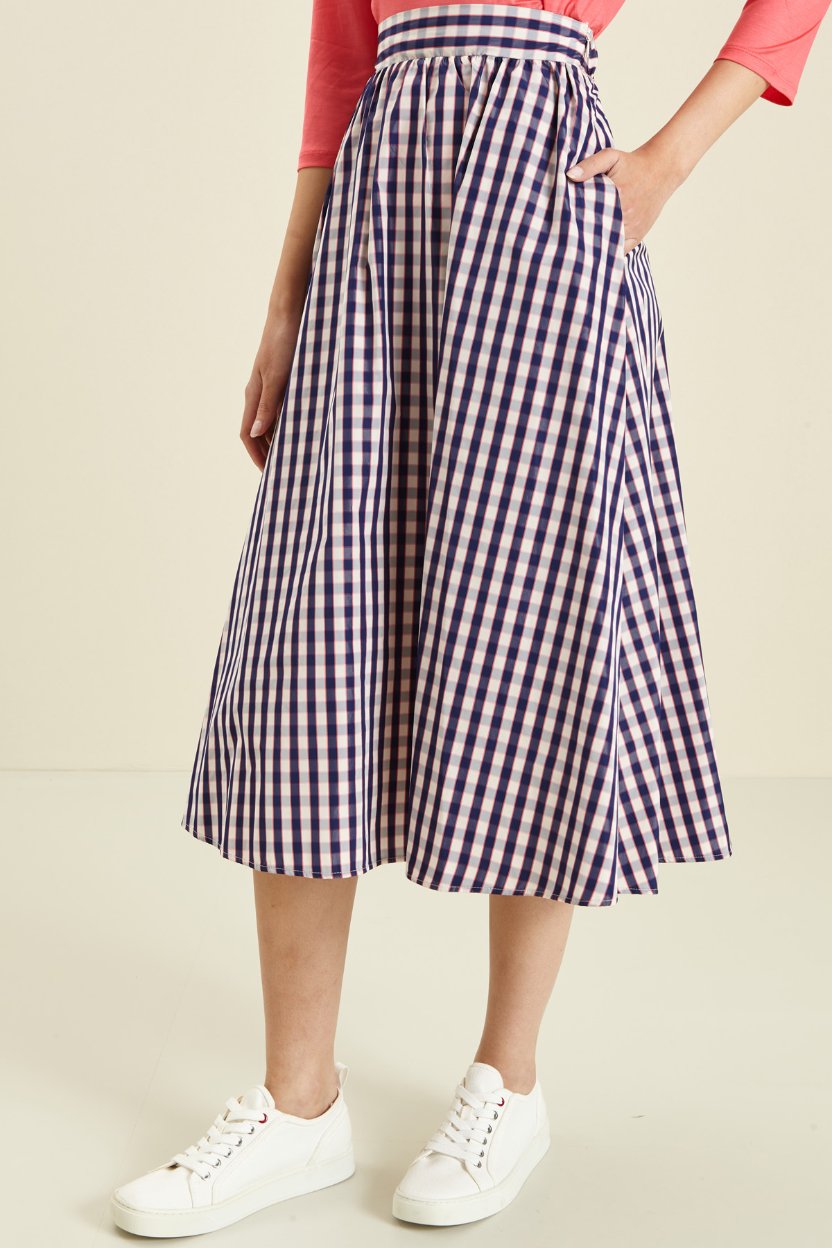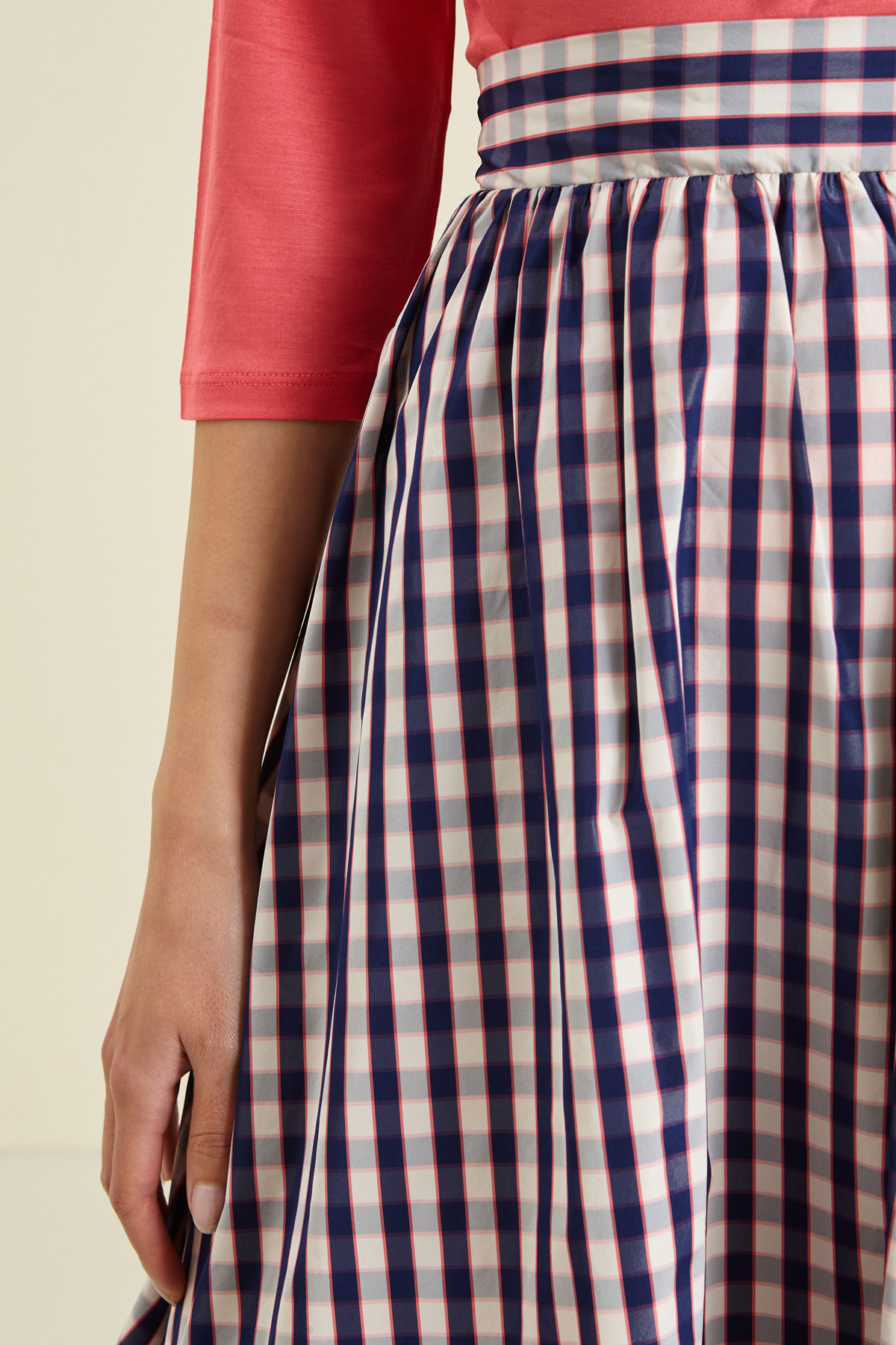 Gonna dalla linea svasata realizzata in tessuto tecnico antigoccia, con cintone e arriccio in vita, tasche laterali inserite in cucitura e chiusura tramite zip invisibile laterale.