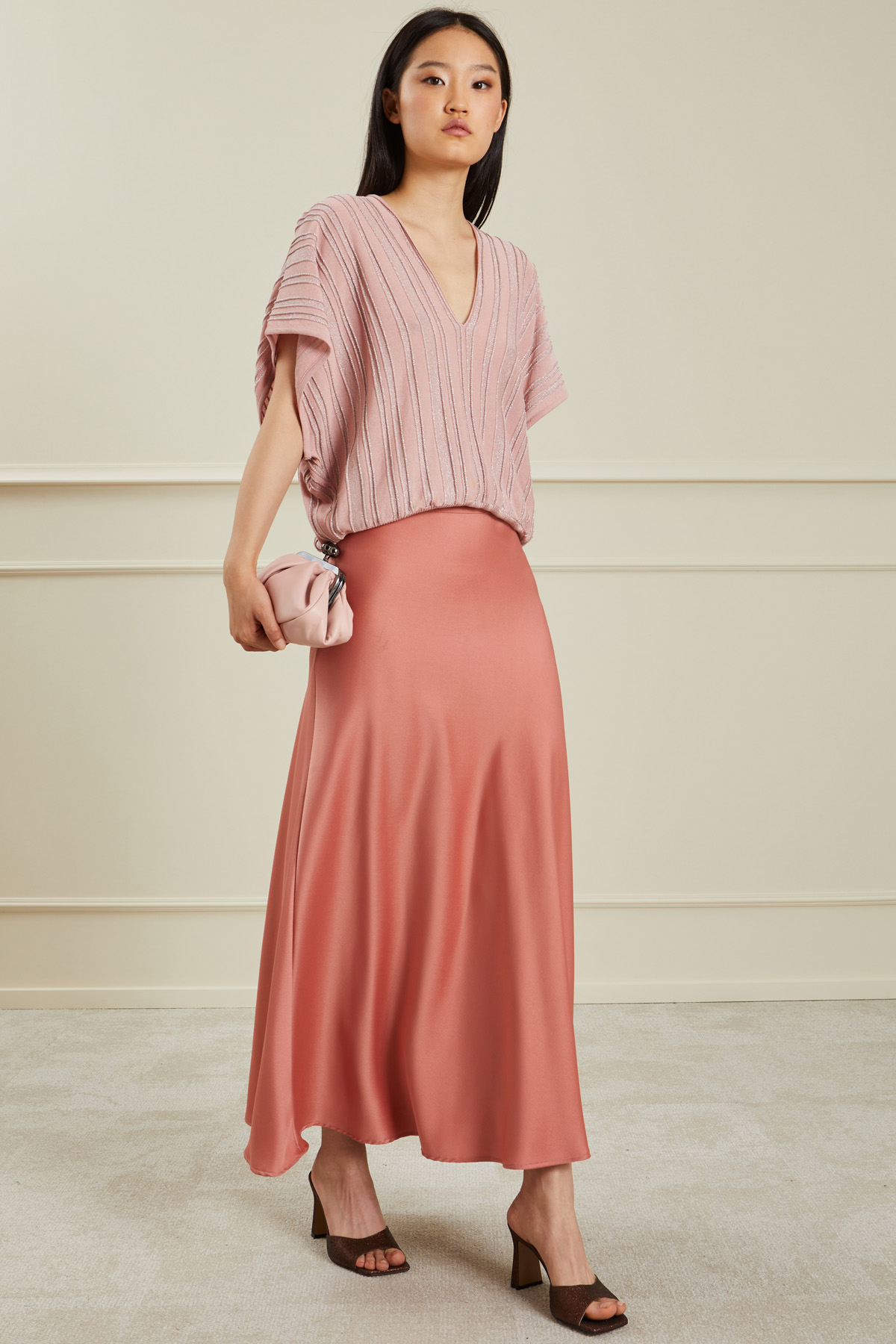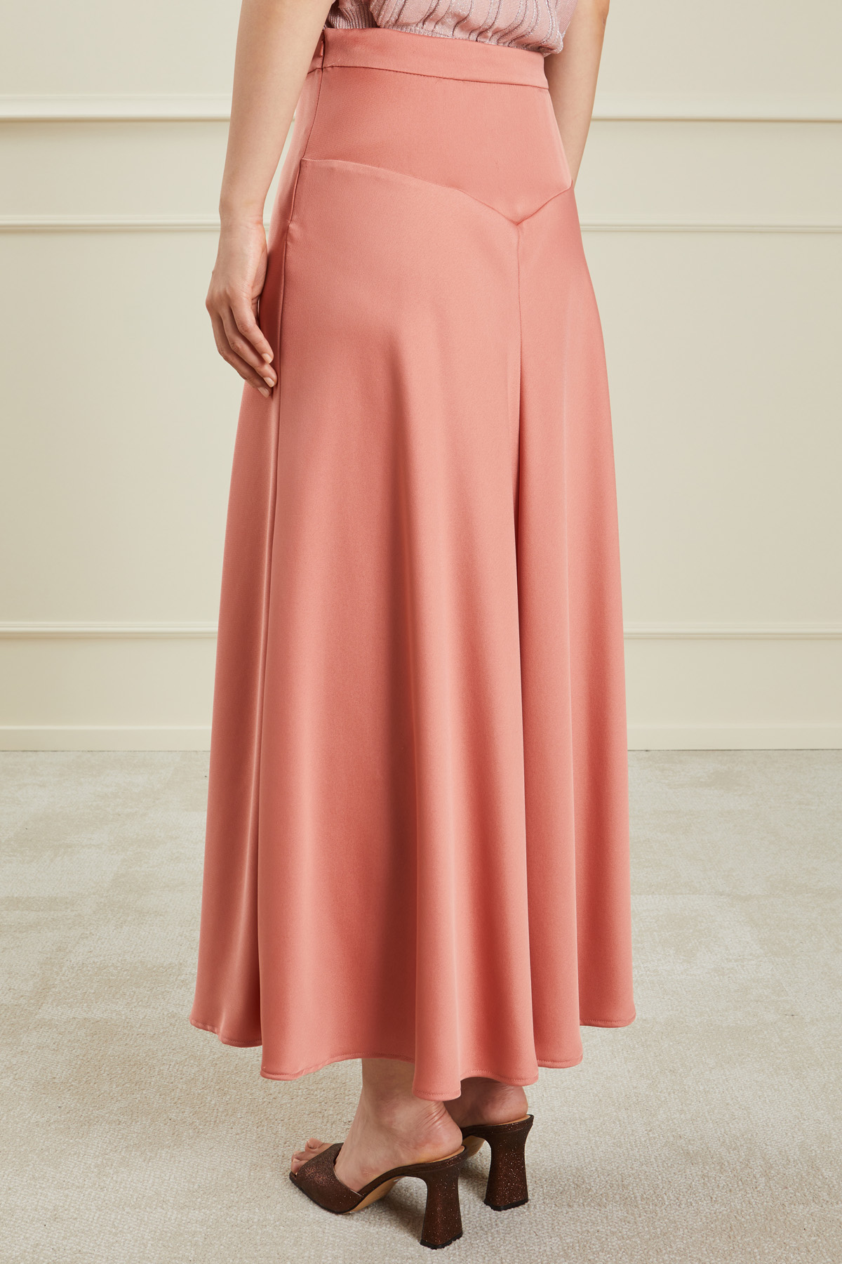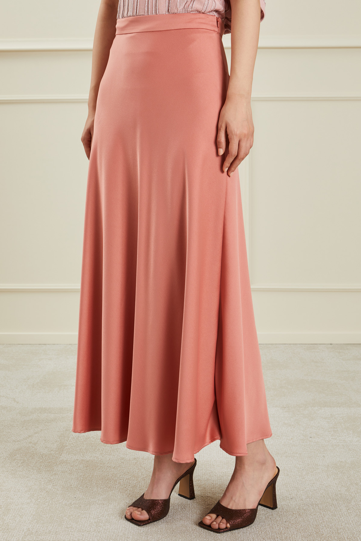 Gonna lunga dalla linea fluida realizzata in raso, con cintone in vita e allacciatura tramite zip invisibile sul fianco.