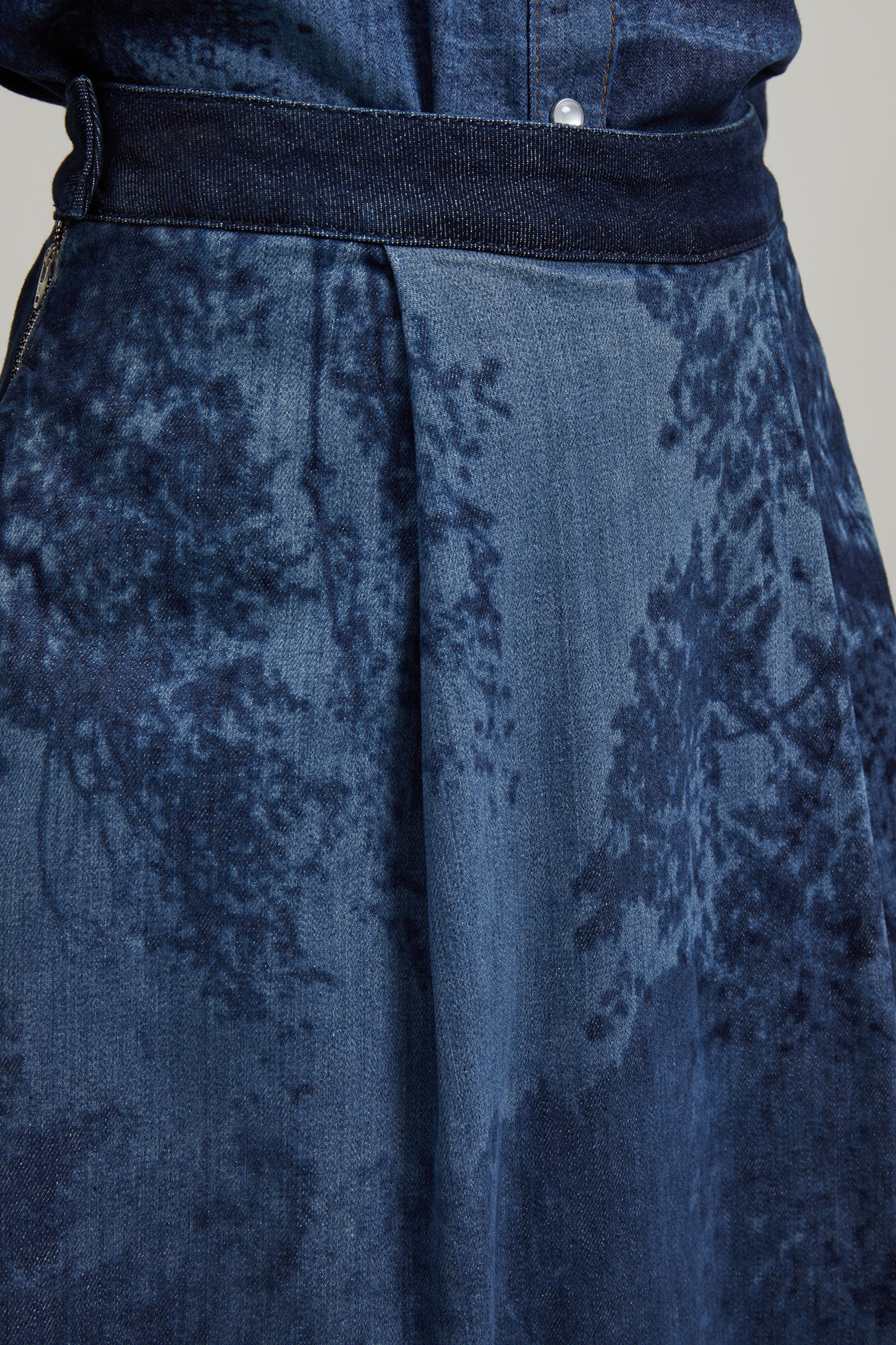 Gonna lunga dalla linea svasata realizzata in denim di cotone stretch stampato, con cintone in vita, dettaglio di pieghe cucite, tasche laterali inserite in cucitura e allacciatura tramite zip e gancio nel retro.