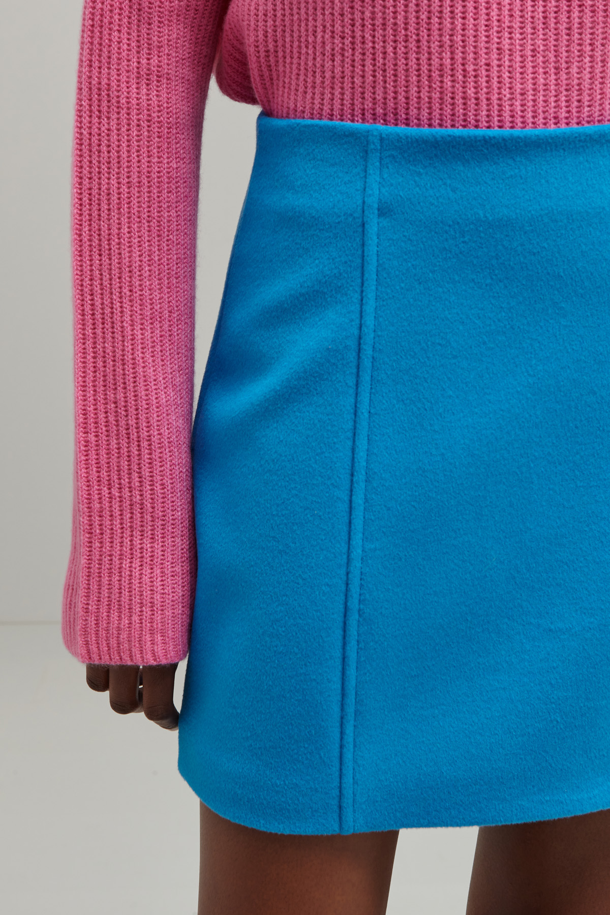 Minigonna dalla linea ad A realizzata in drap di pura lana con dettagli a rilievo. Allacciatura tramite zip invisibile sul fianco. Foderata.