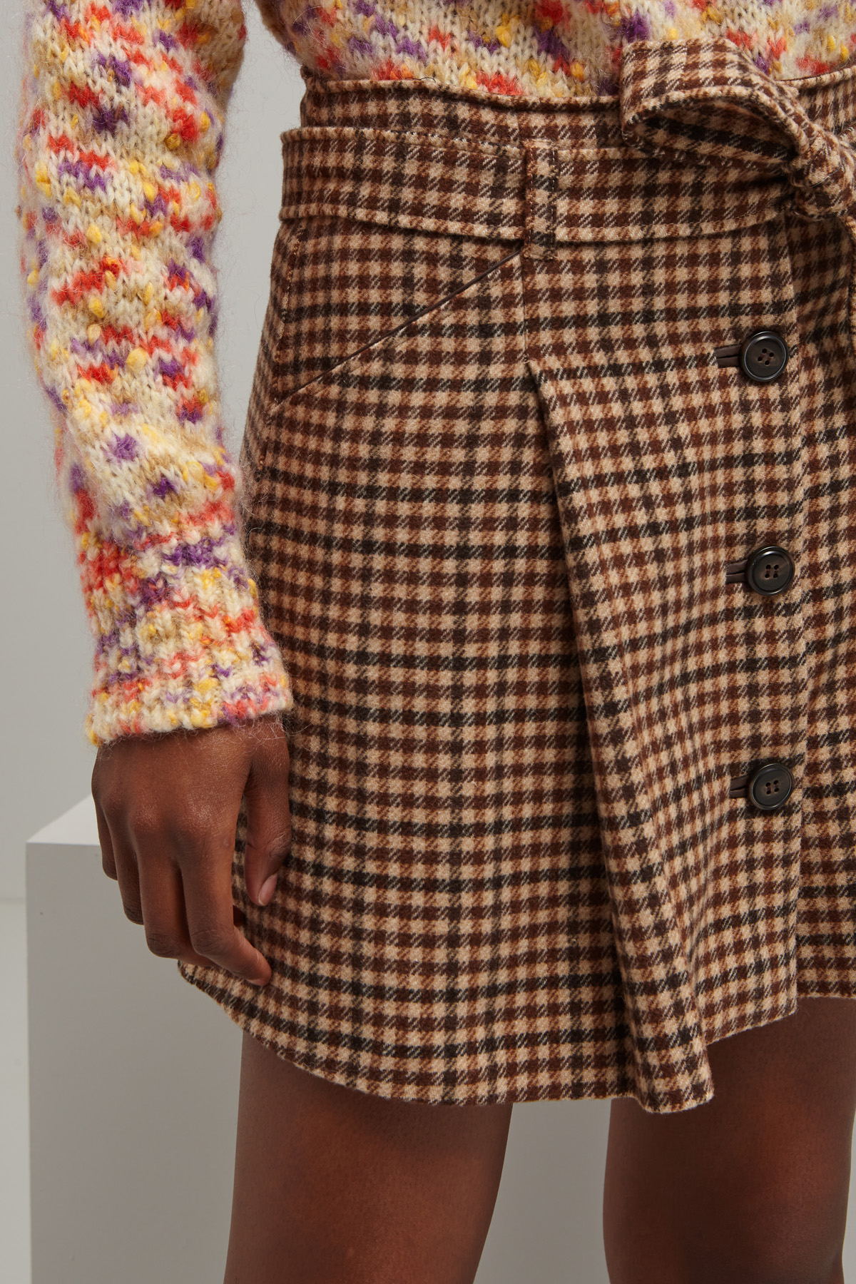 Gonna corta dalla linea dritta realizzata in tessuto a lisca di pesce di misto lana tinto filo, con passanti in vita, dettaglio di pieghe cucite, tasche laterali alla francese e allacciatura tramite bottoni a tutta lunghezza. Capo dotato di cintura coordinata. Foderata.