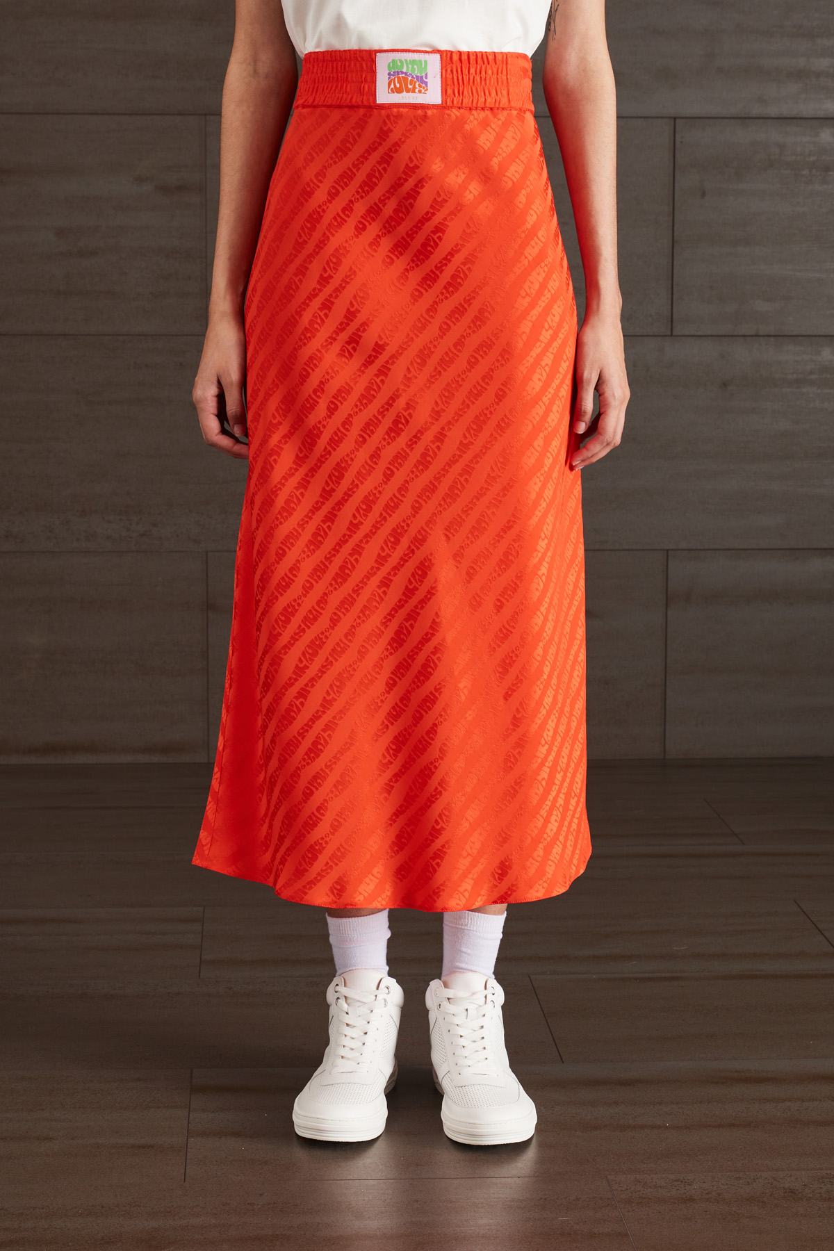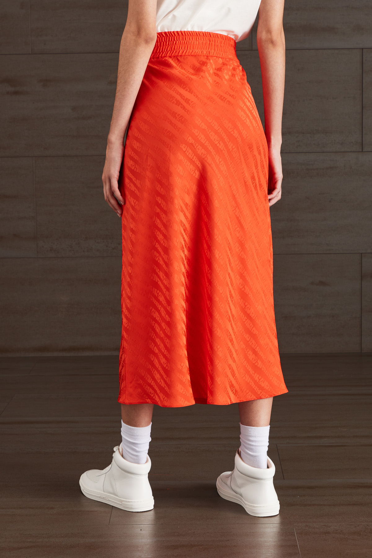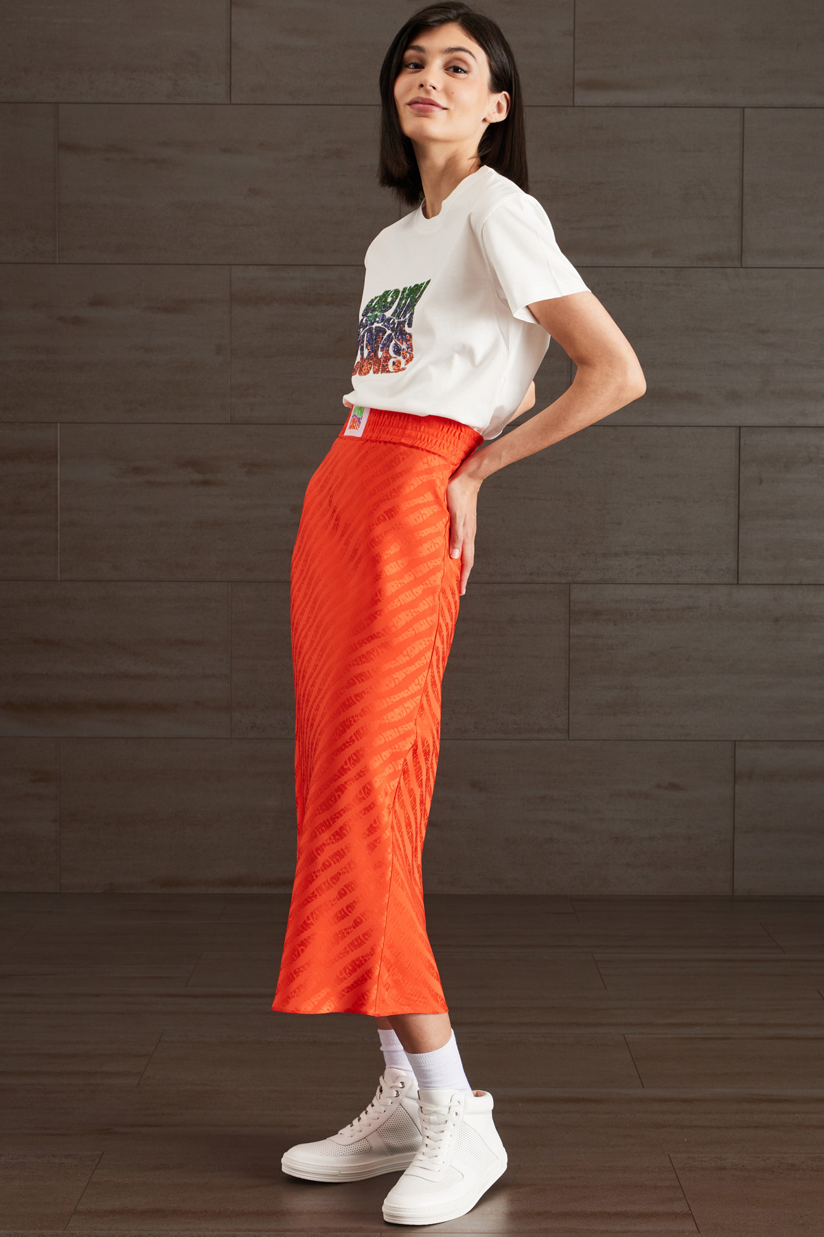 Gonna lunga a tubo dalla linea morbida realizzata in tessuto jacquard di misto viscosa, con inserto elastico in vita e dettaglio cucito sul davanti.