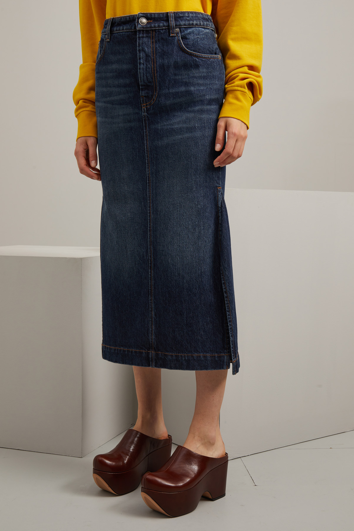 Gonna midi dalla linea svasata realizzata in denim di puro cotone, con passanti in vita, cinque tasche e spacchi laterali al fondo. Allacciatura tramite zip nascosta e bottone metallico.
