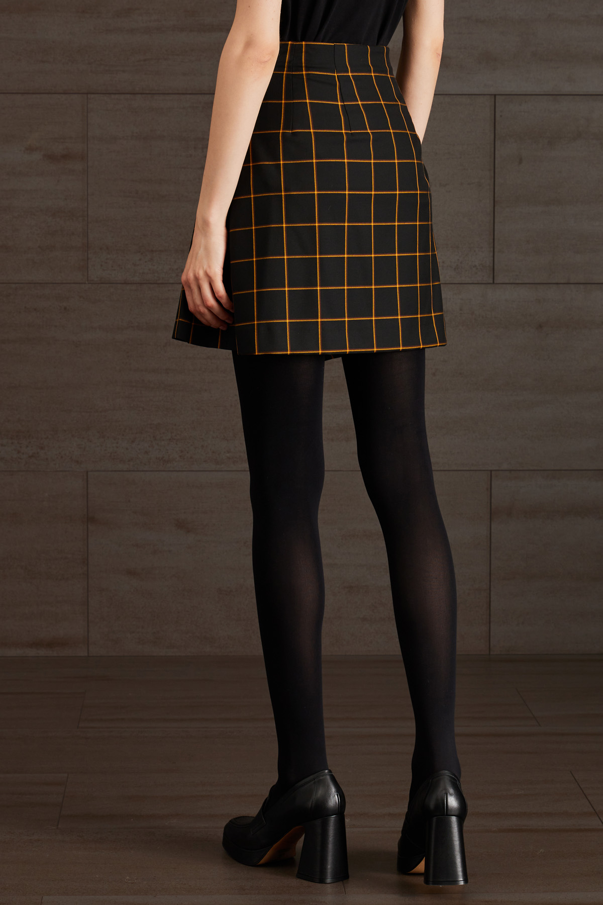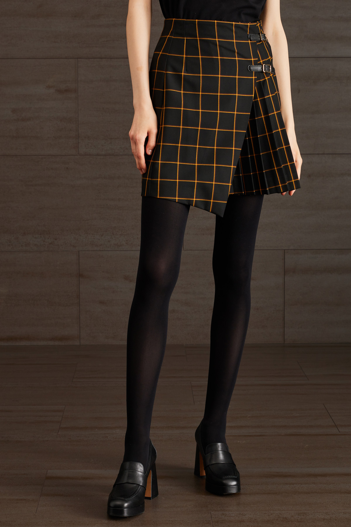 Gonna corta dalla linea a portafoglio realizzata in tessuto di misto viscosa stretch tinto filo, con pannello lavorato a pieghe e allacciatura tramite cinturini in similpelle sul davanti.