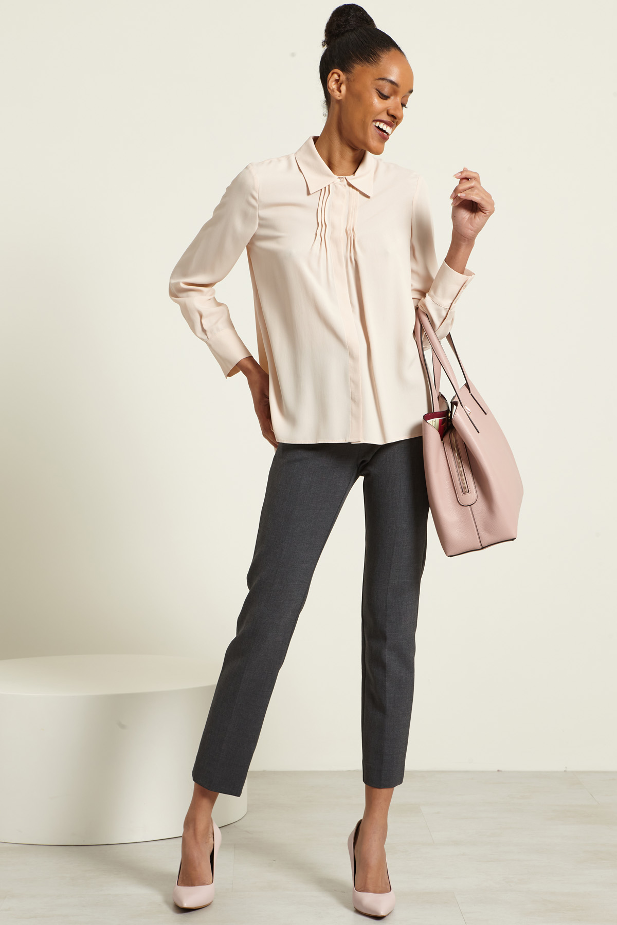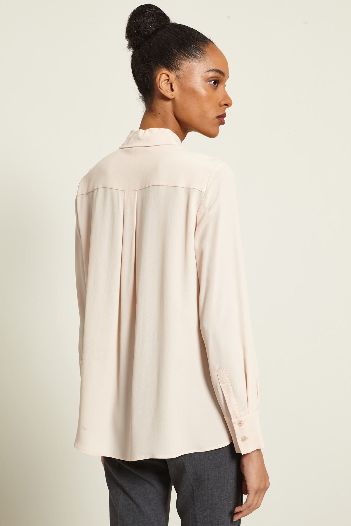 Camicia dalla linea fluida realizzata in crèpe de chine di misto seta, con colletto classico e motivo di pieghe cucite, maniche lunghe con polsino e bottoni, carrè e cannoncino nel retro. Allacciatura nascosta tramite bottoni.