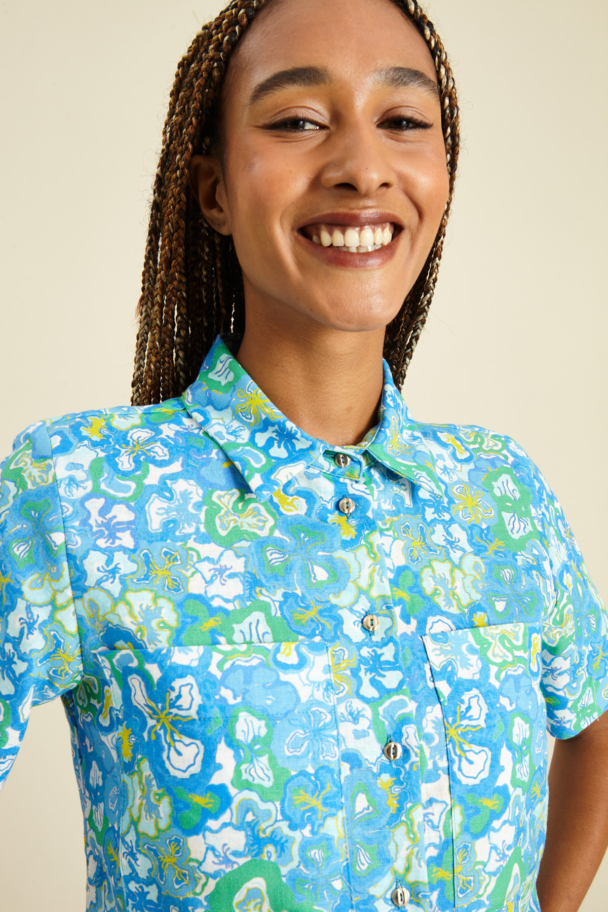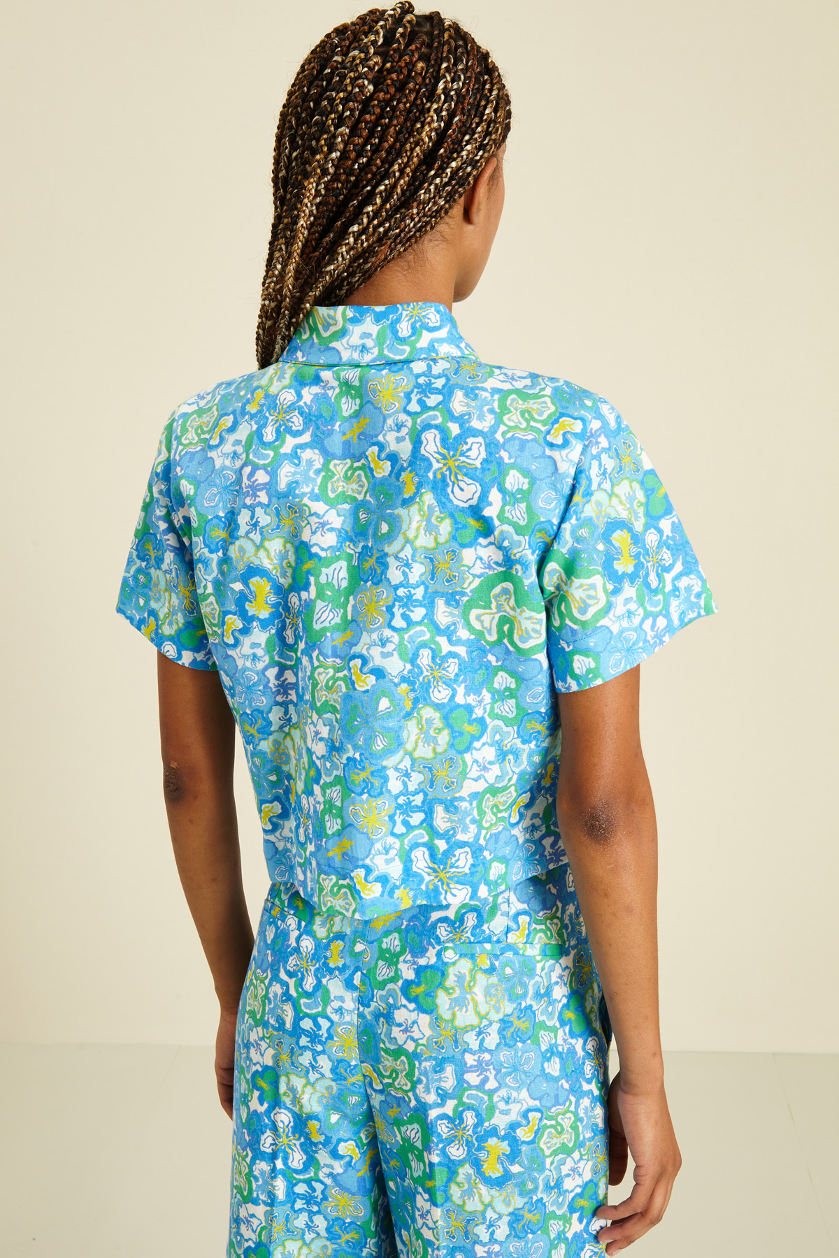 Camicia dalla linea dritta realizzata in tela di cotone e lino stampato, con colletto classico, maniche corte, taschini applicati sul petto e allacciatura tramite bottoni a vista.