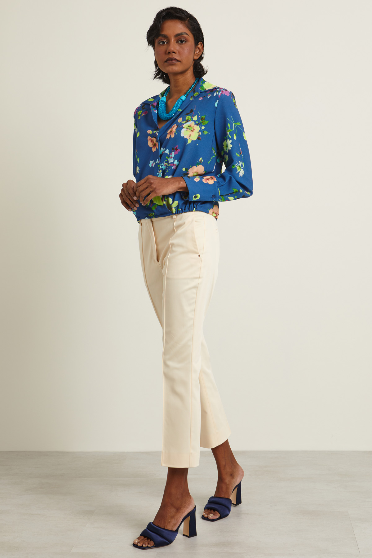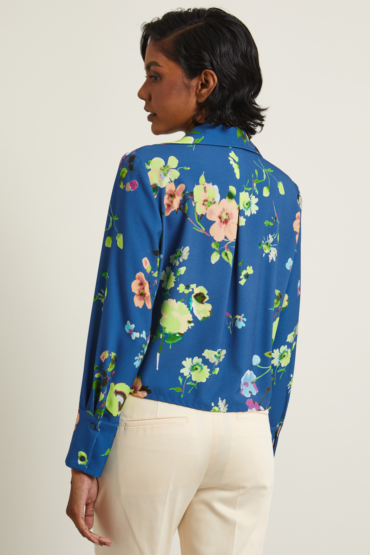Blusa dalla linea fluida realizzata in tessuto sablé stampato incrociato con colletto classico, maniche lunghe con polso alto e bottoni, inserto elastico in vita sul davanti e retro con contropiega. Allacciatura tramite bottone.