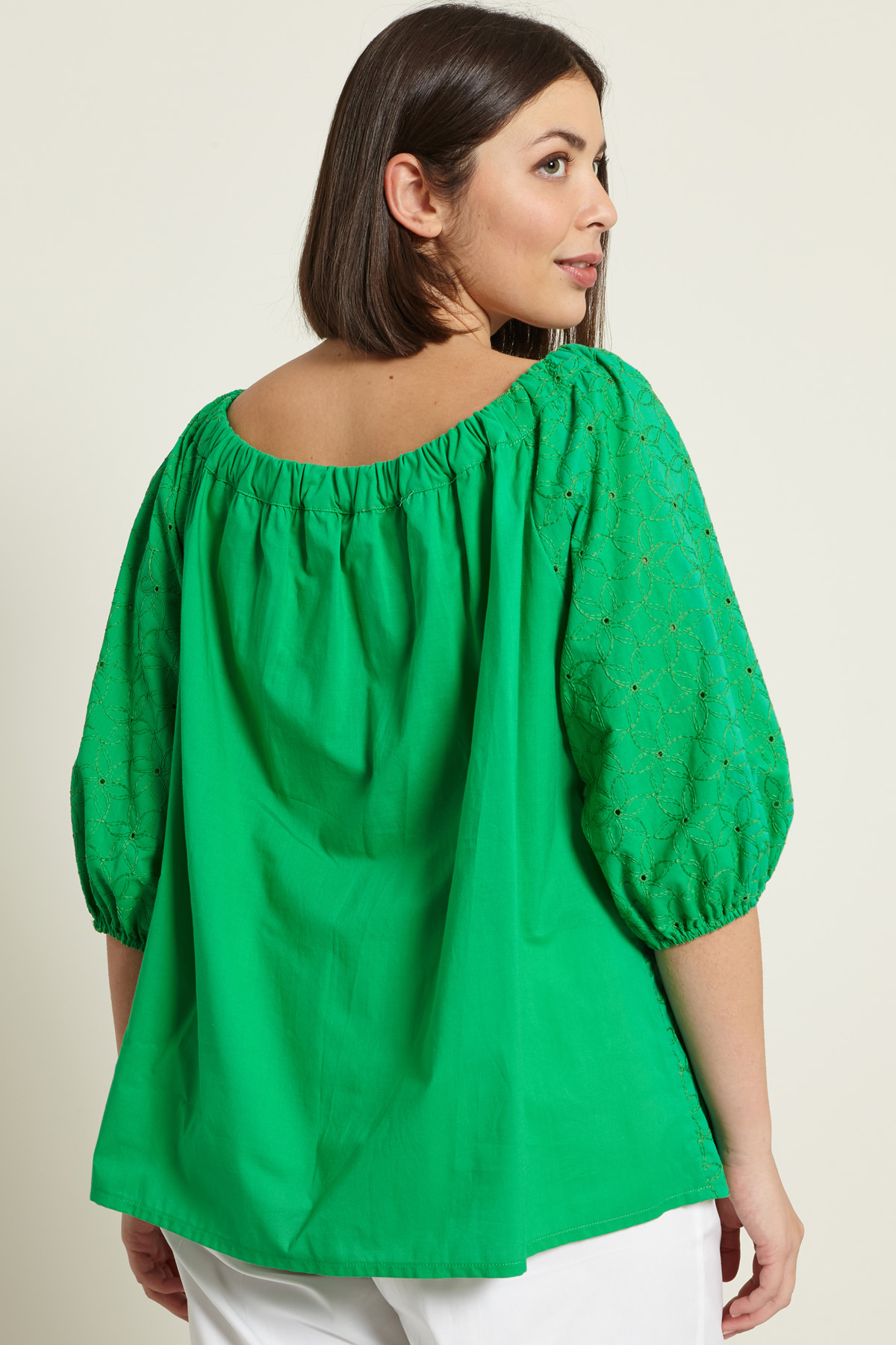 Blusa dalla linea dritta realizzata in tela di misto cotone con lavorazione sangallo, scollo ampio, inserto elastico sullo scollo e a fondo manica, maniche tre quarti a palloncino.