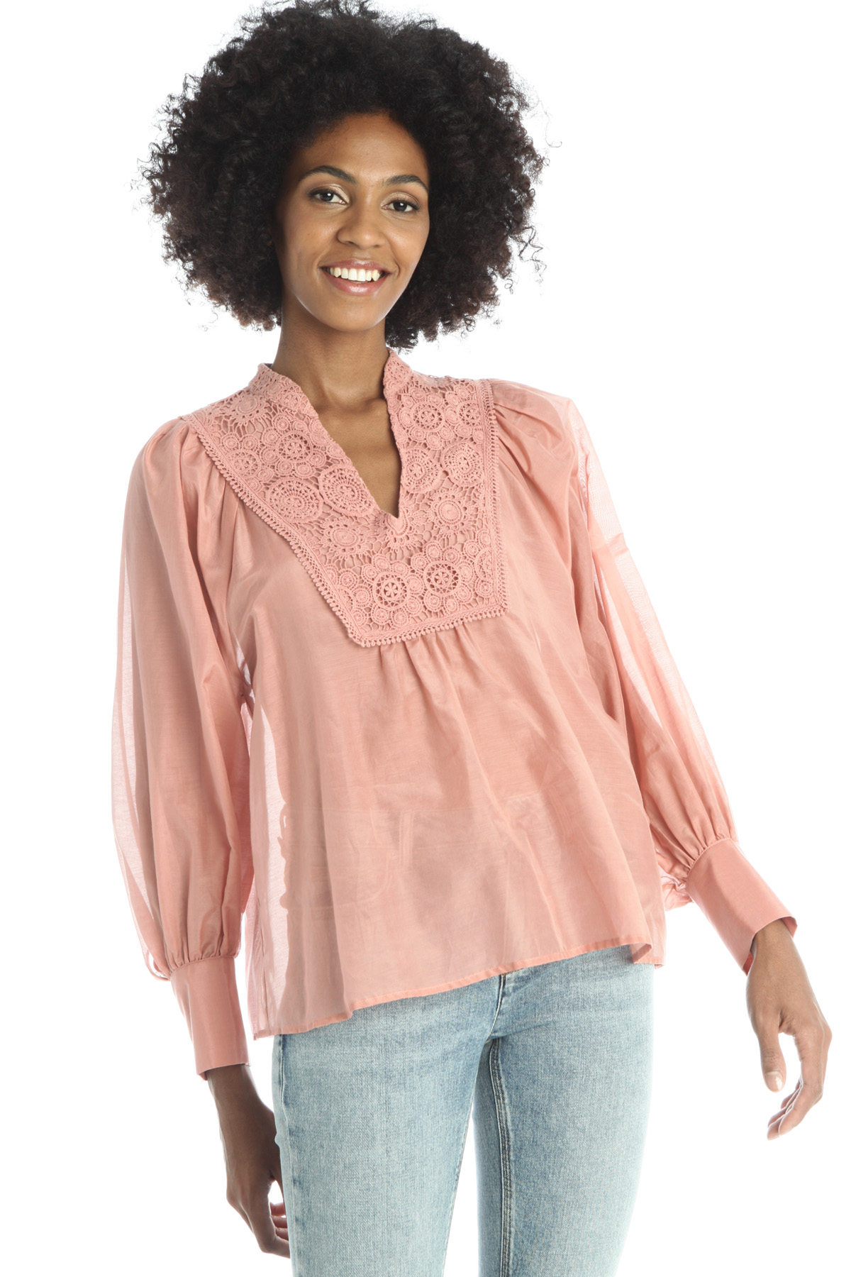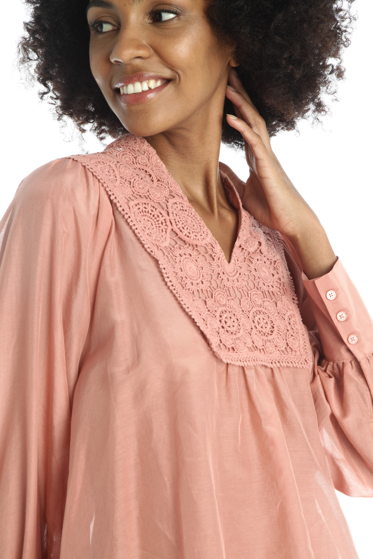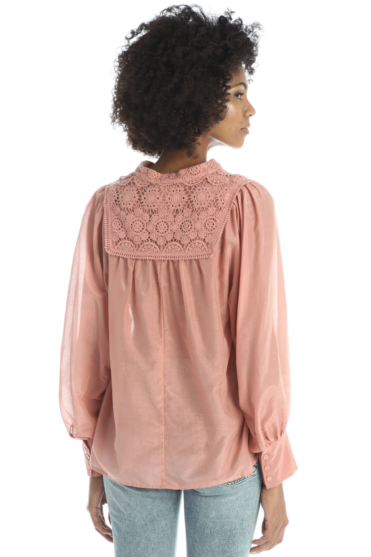 Casacca dalla linea morbida realizzata in voile di cotone e seta, con scollo a V, inserto lavorato in pizzo di cotone e maniche lunghe con polsino e bottoni.