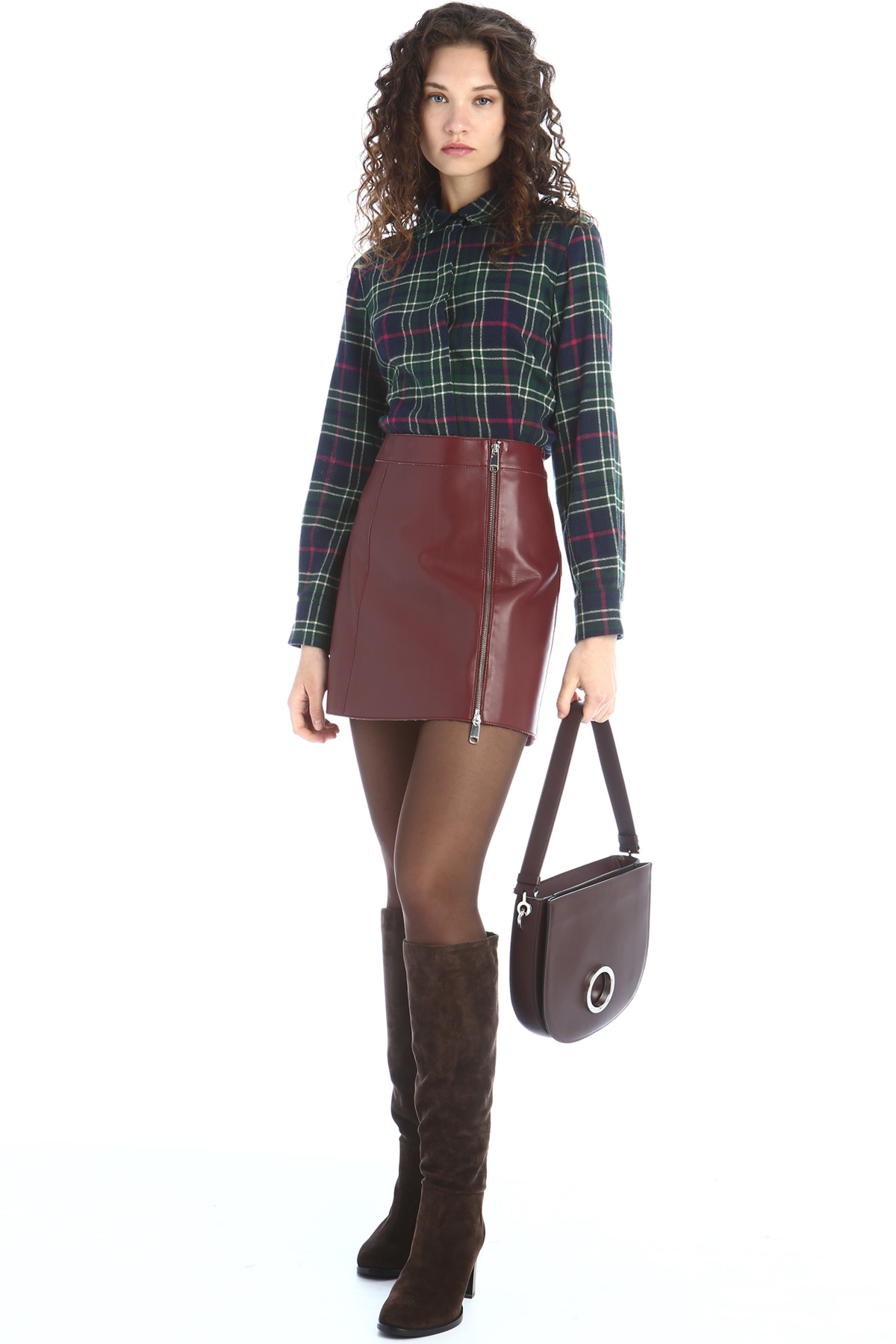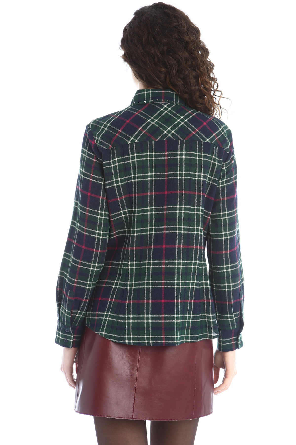 Camicia dalla linea dritta realizzata in tessuto di misto viscosa e lana tinto filo, colletto a camicia con dettaglio di borchie applicate, maniche lunghe con polsino e bottoni, allacciatura nascosta tramite bottoni.
