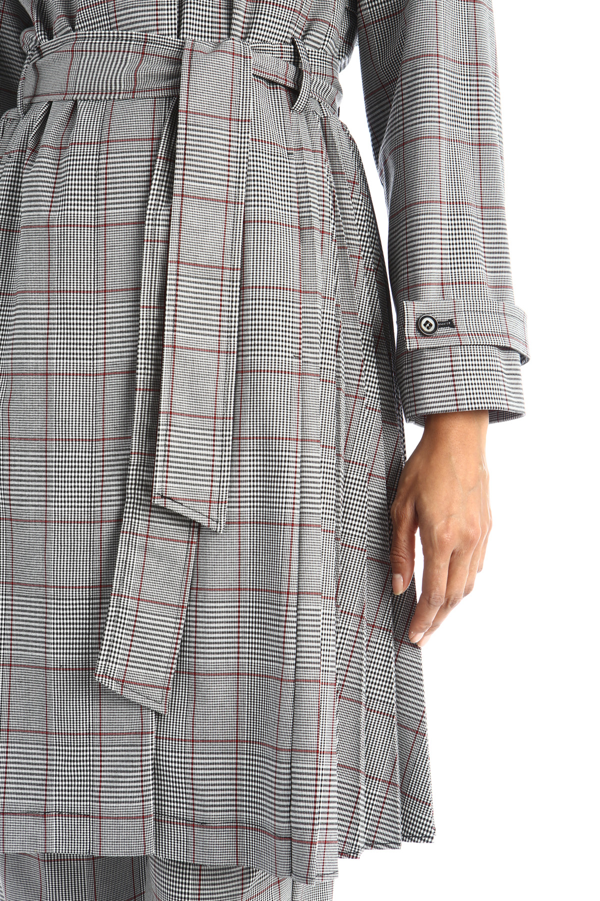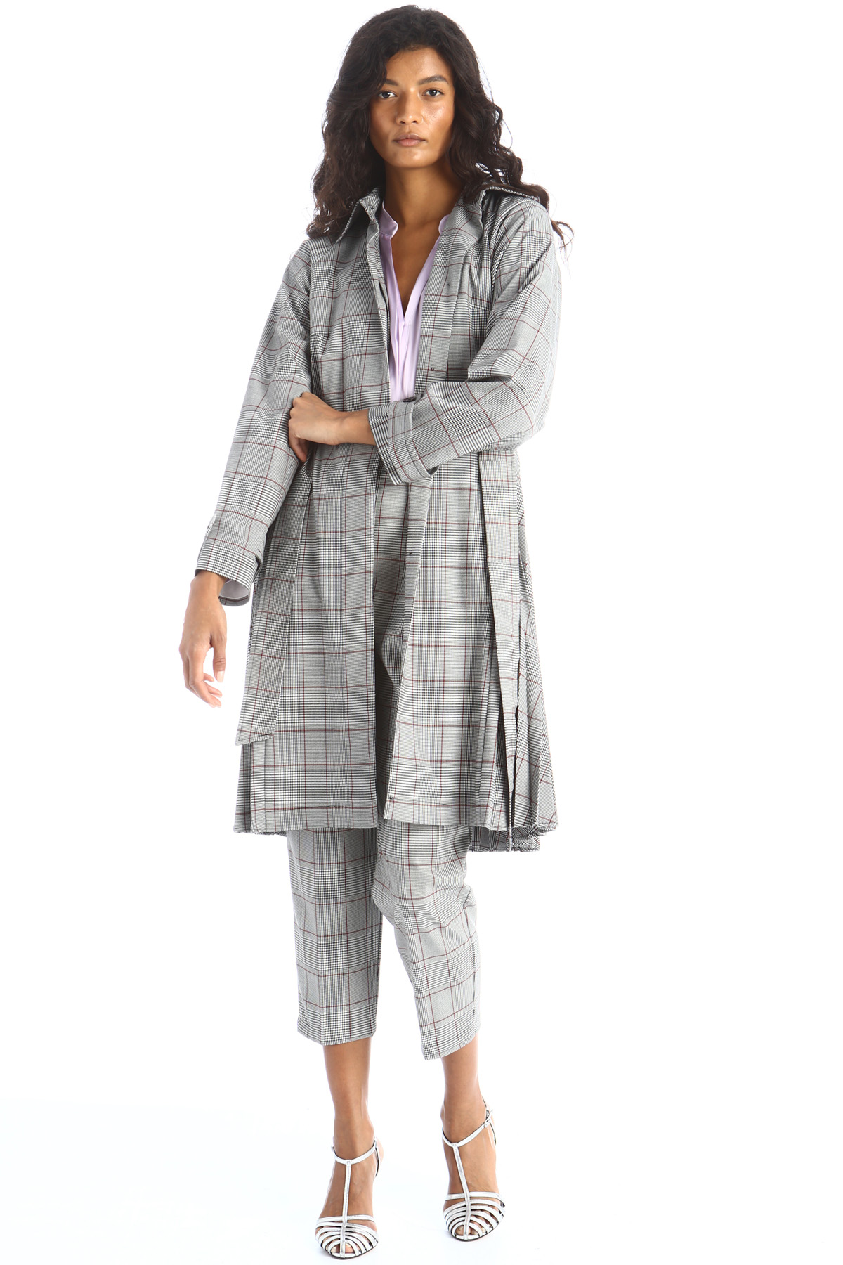 Trench dalla linea svasata realizzato in tela fluida, con lavorazione tinto filo, colletto a camicia, maniche raglan con alamari ai polsi, tasche laterali inserite nella cucitura, mantella ed inserto plissè dietro. Allacciatura tramite bottoni nascosti e cintura coordinata. Foderato.