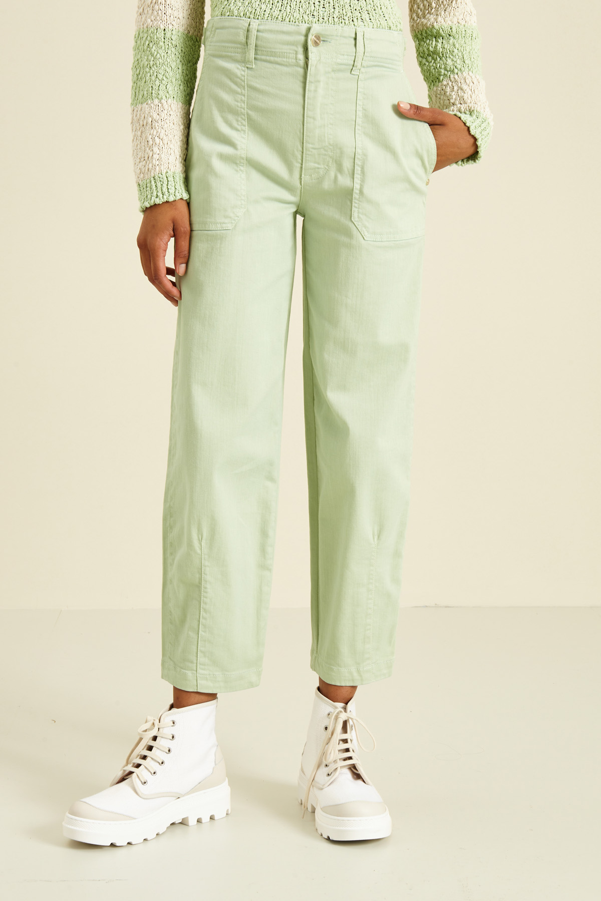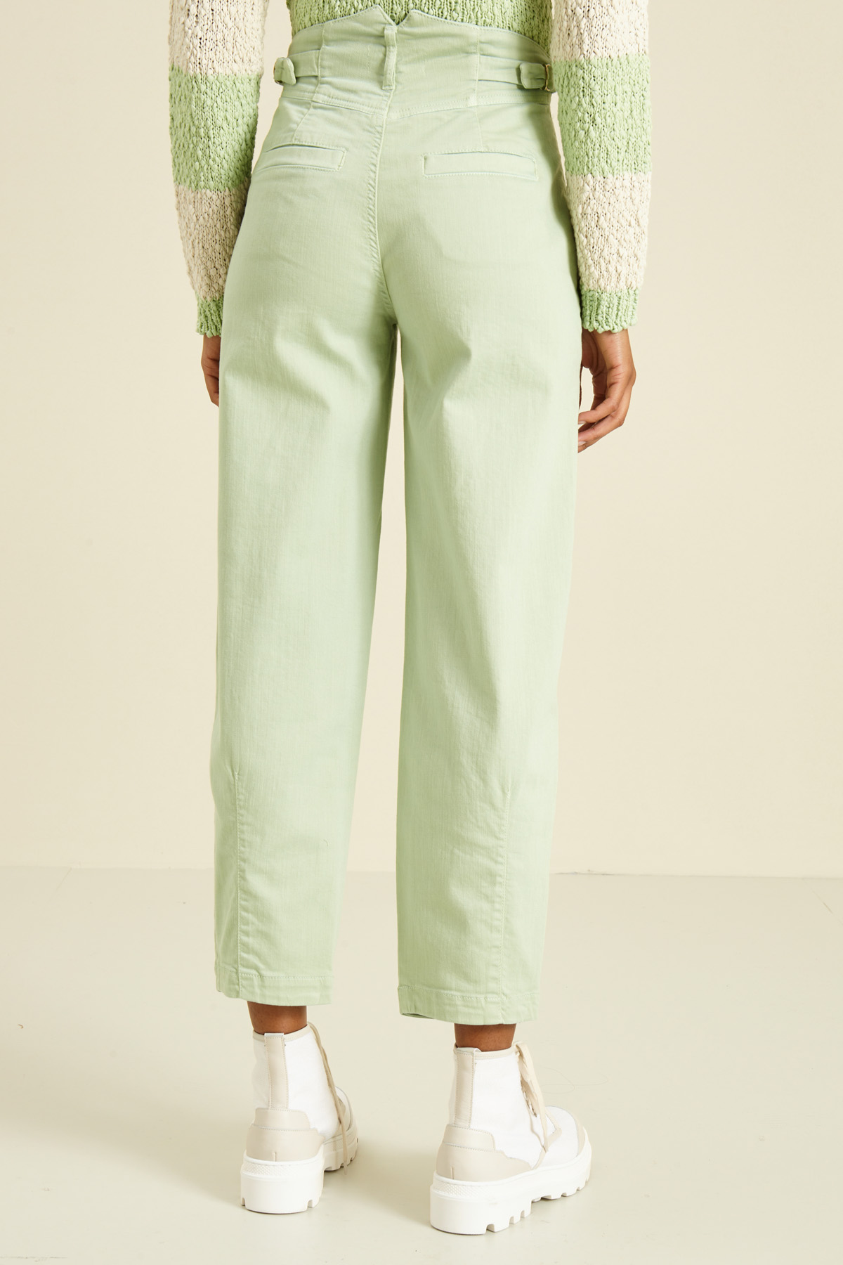 Pantaloni dalla linea dritta realizzati in bull di misto cotone, con passanti e cinturini in vita, tasche alla francese sul davanti e a filetto nel retro. Allacciatura tramite zip nascosta e bottone metallico.