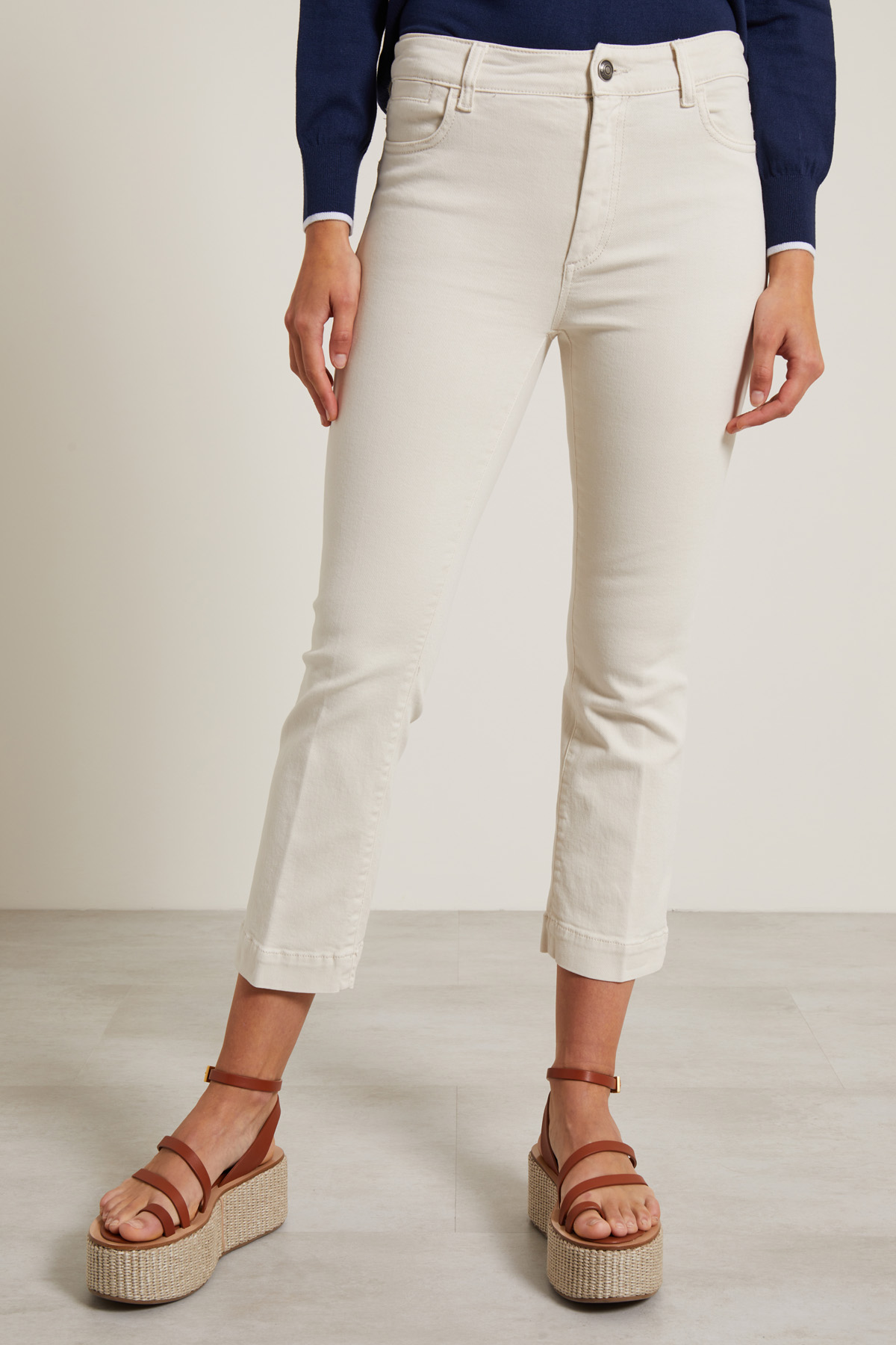 Pantaloni dalla linea leggermente flare realizzati in bull di cotone stretch, con passanti in vita, cinque tasche e finto risvolto al fondo. Allacciatura tramite zip nascosta e bottone metallico.