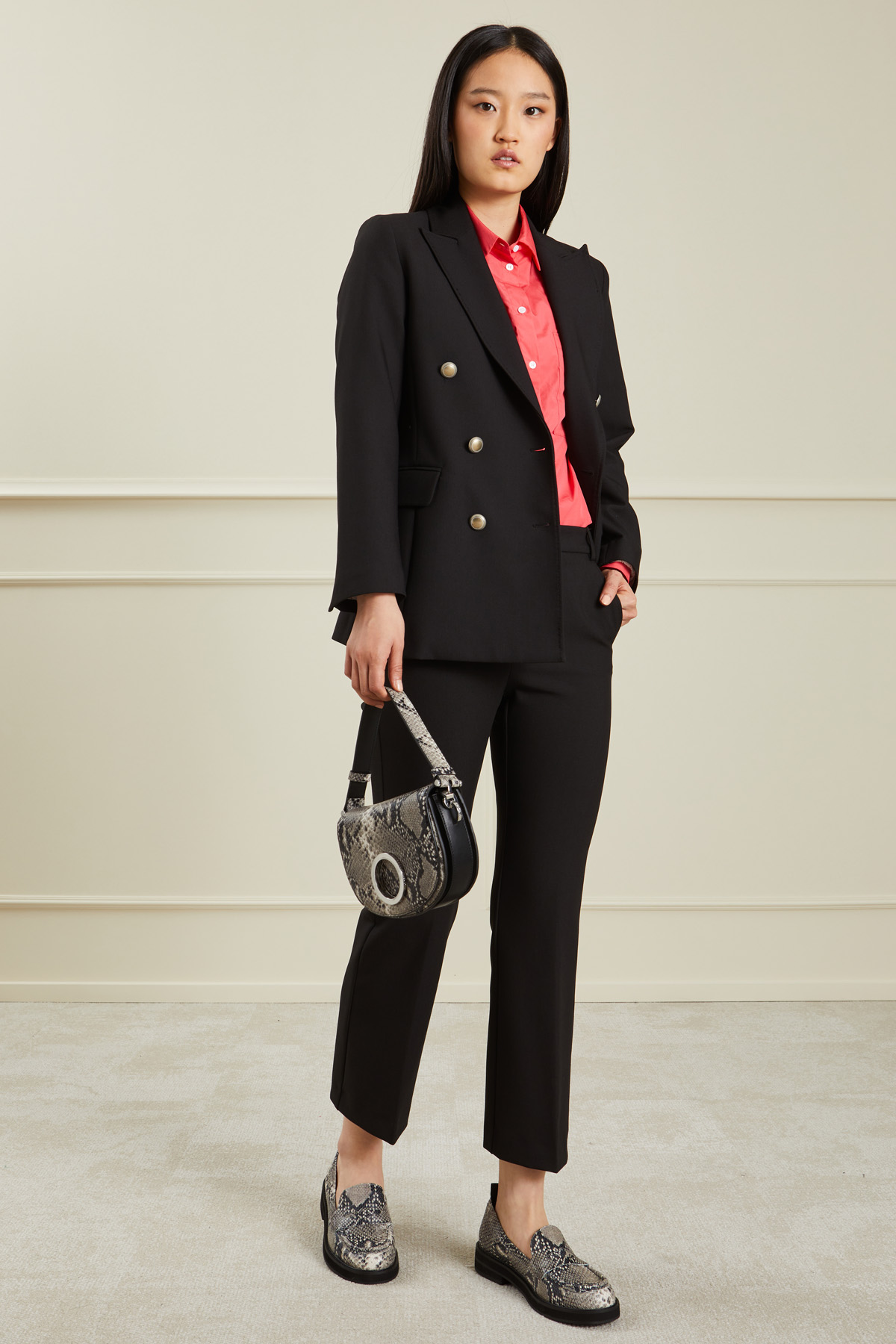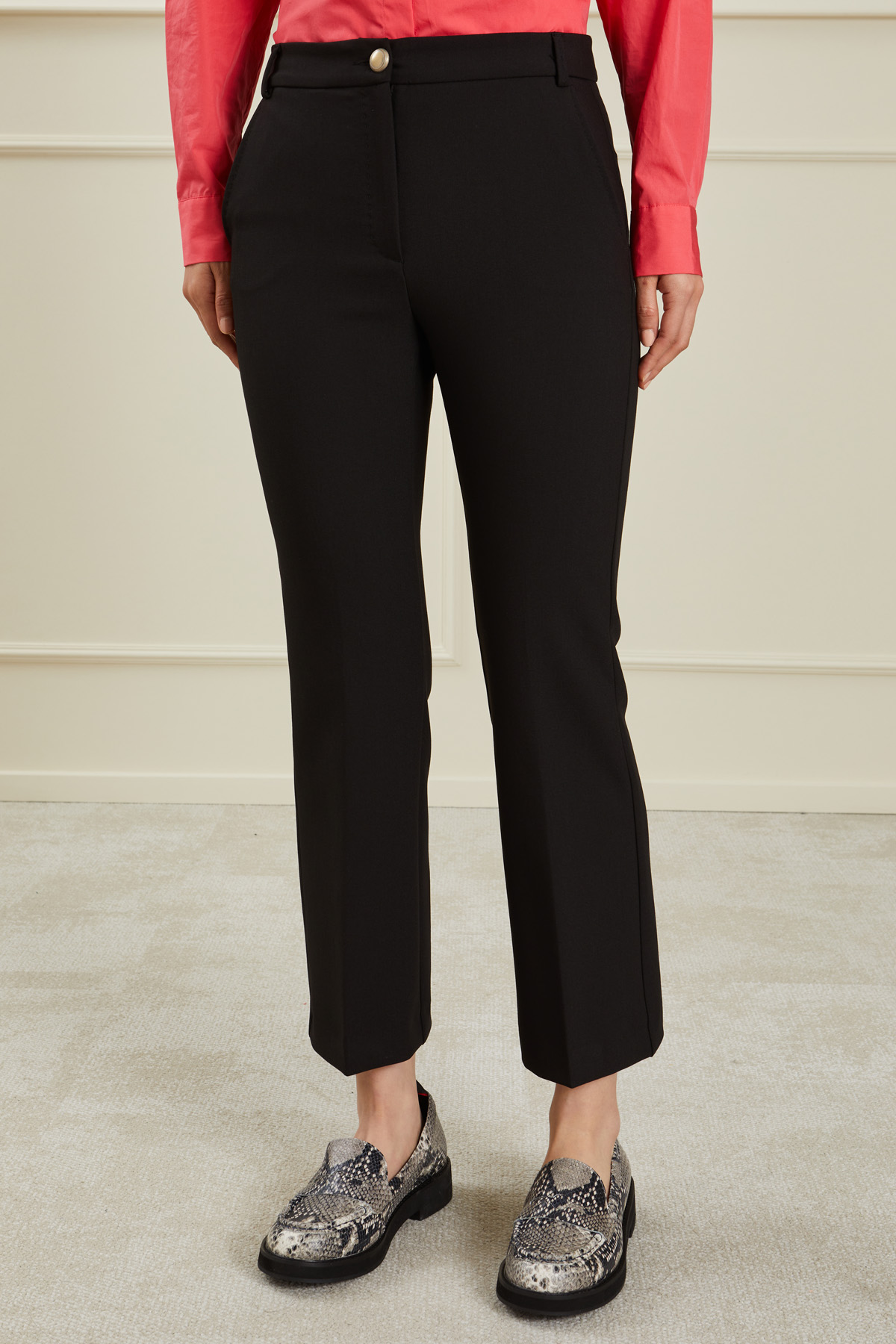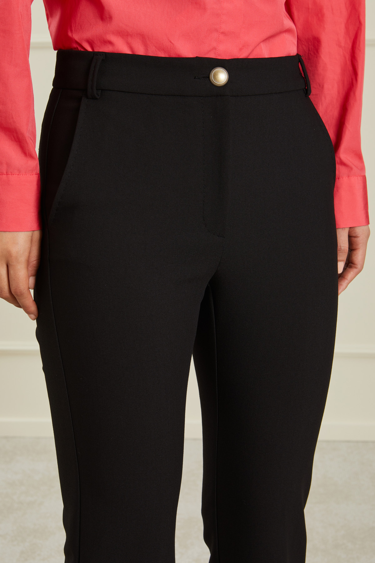 Pantaloni dalla linea aderente realizzati in tela doppia di misto viscosa stretch, con passanti in vita, tasche laterali alla francese sul davanti e a filetto nel retro, rifinitura a puntino e allacciatura tramite zip nascosta e bottone metallico.