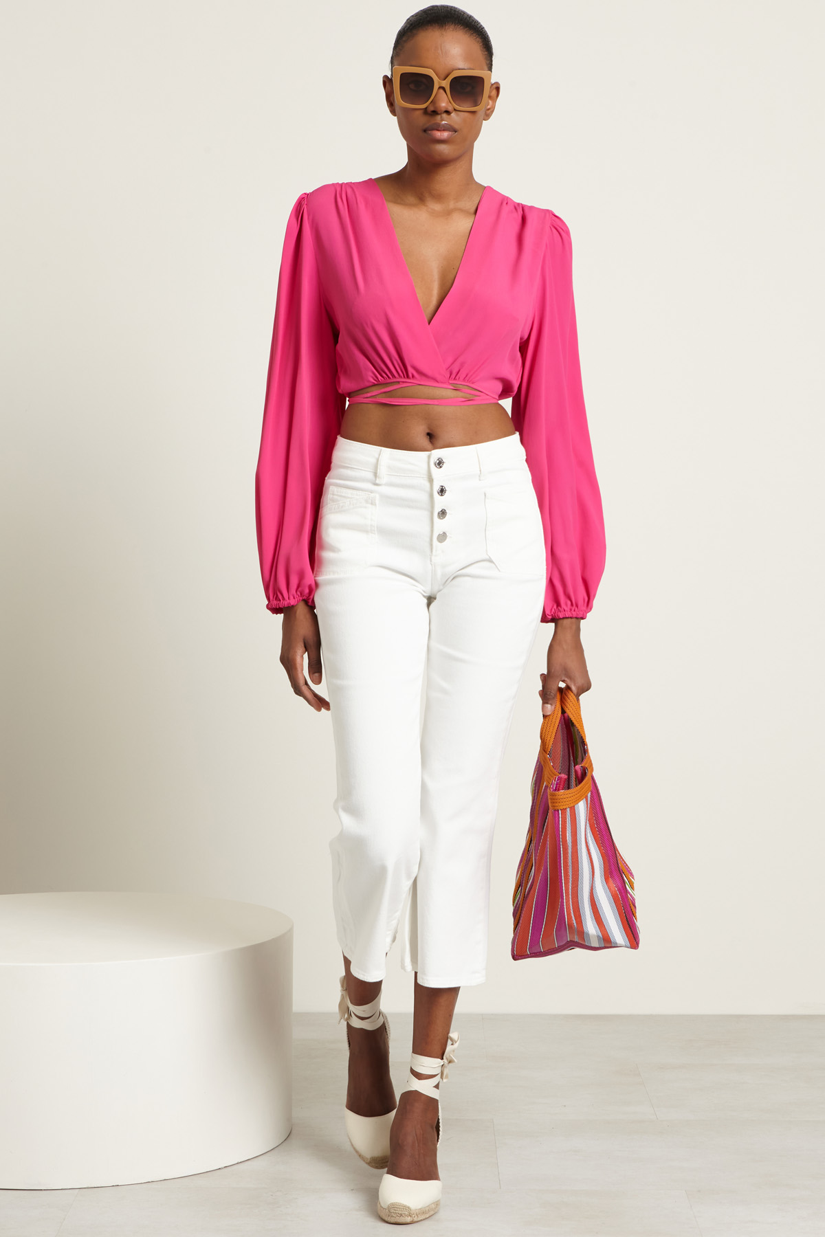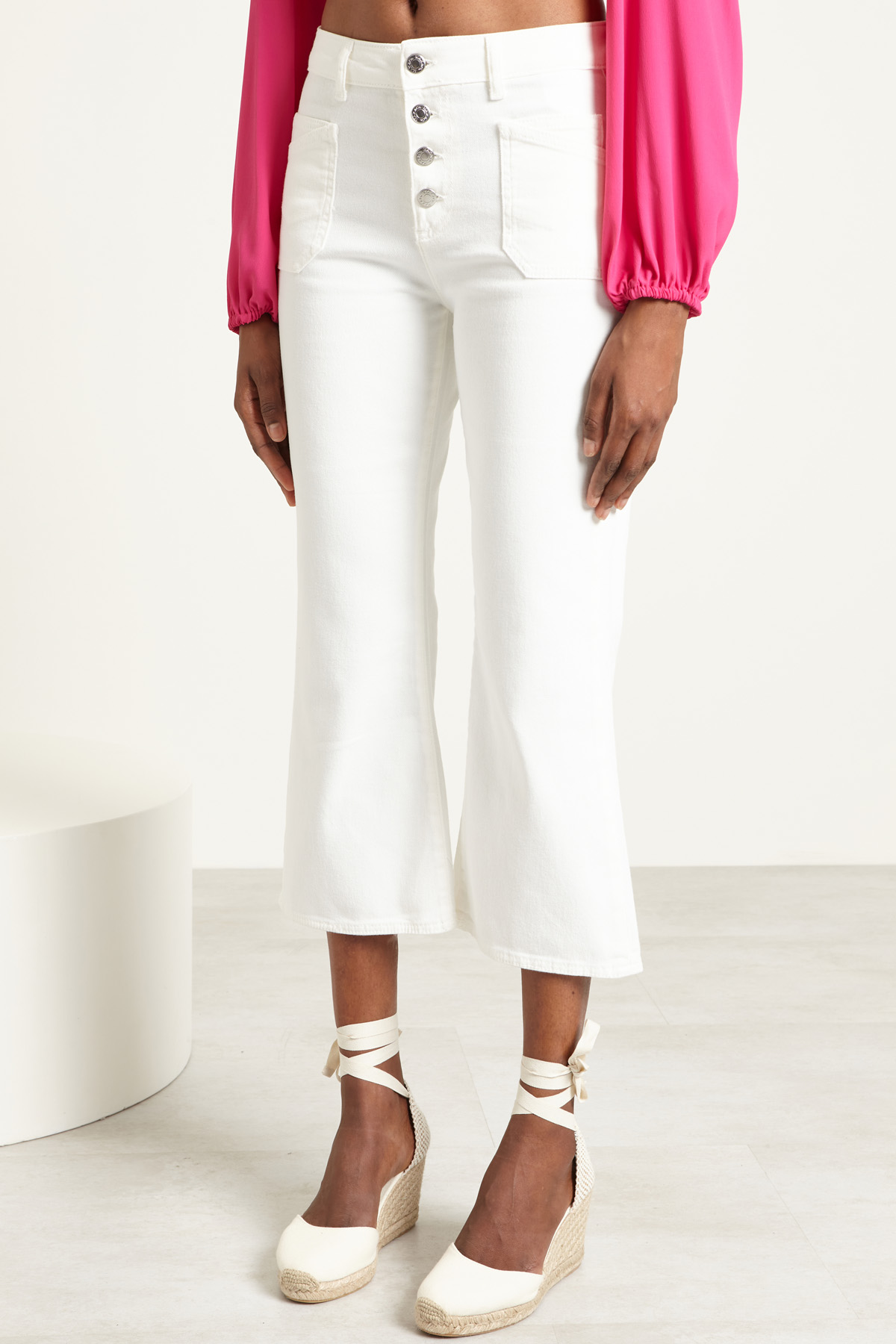 Pantaloni cropped a trombetta realizzati in drill di cotone stretch, con passanti in vita, tasche e taschini applicati sui fianchi e nel retro, allacciatura tramite bottoni a vista in metallo.