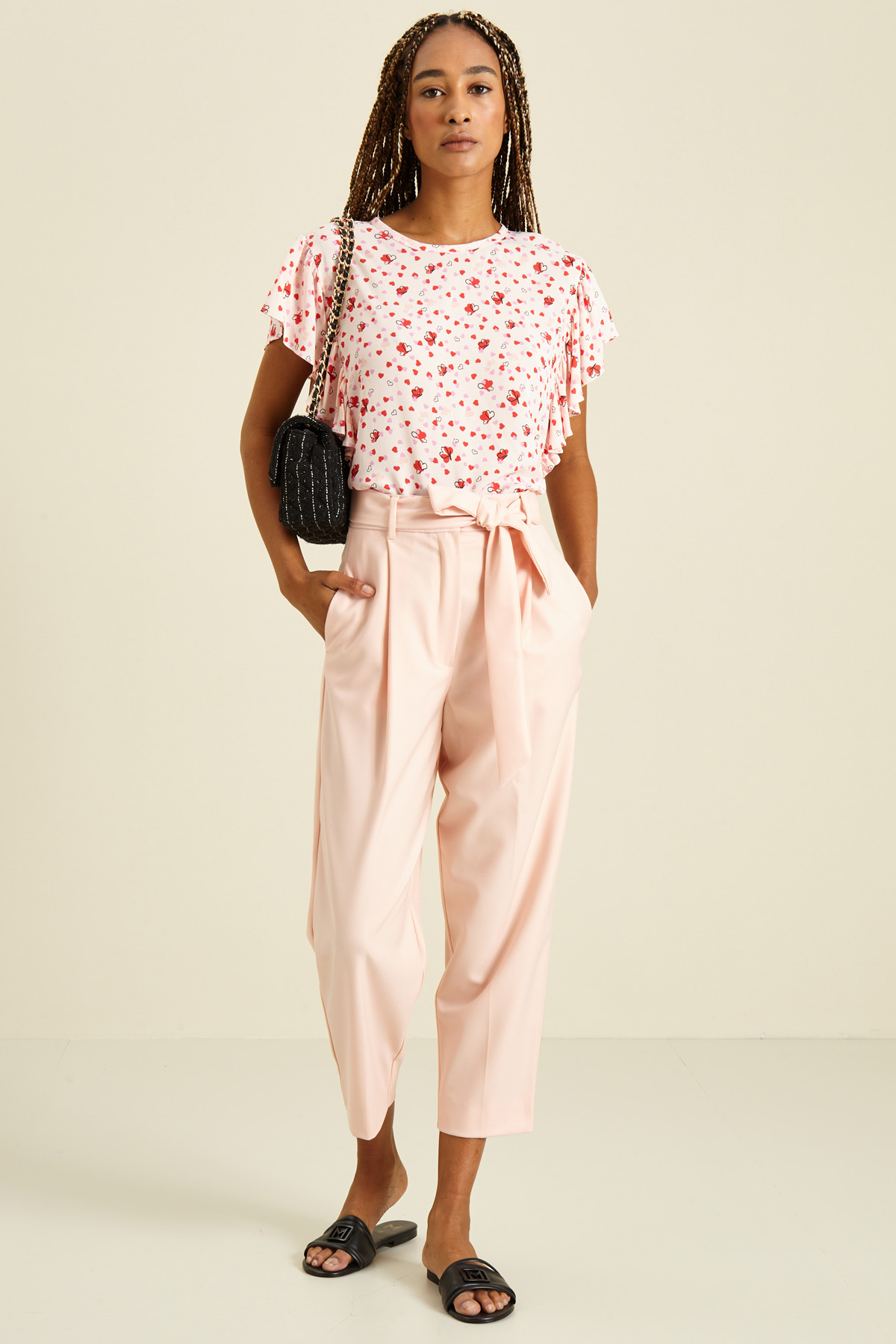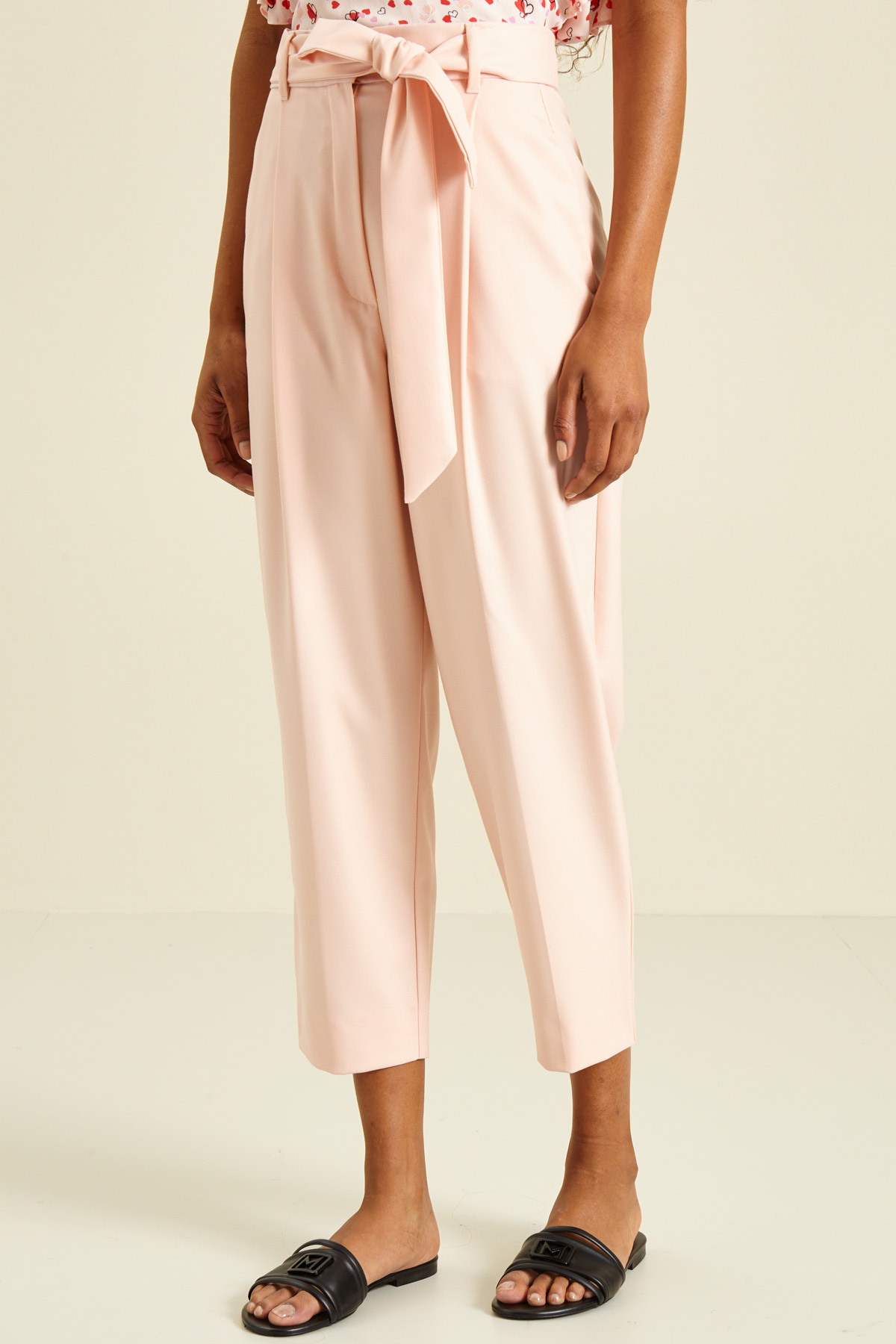 Pantaloni baggy realizzati in tessuto di misto viscosa stretch, con passanti in vita, tasche laterali inserite in cucitura sul davanti e a filetto nel retro, motivo di pieghe cucite e allacciatura nascosta tramite zip, bottone e gancio. Capo dotato di cintura coordinata.