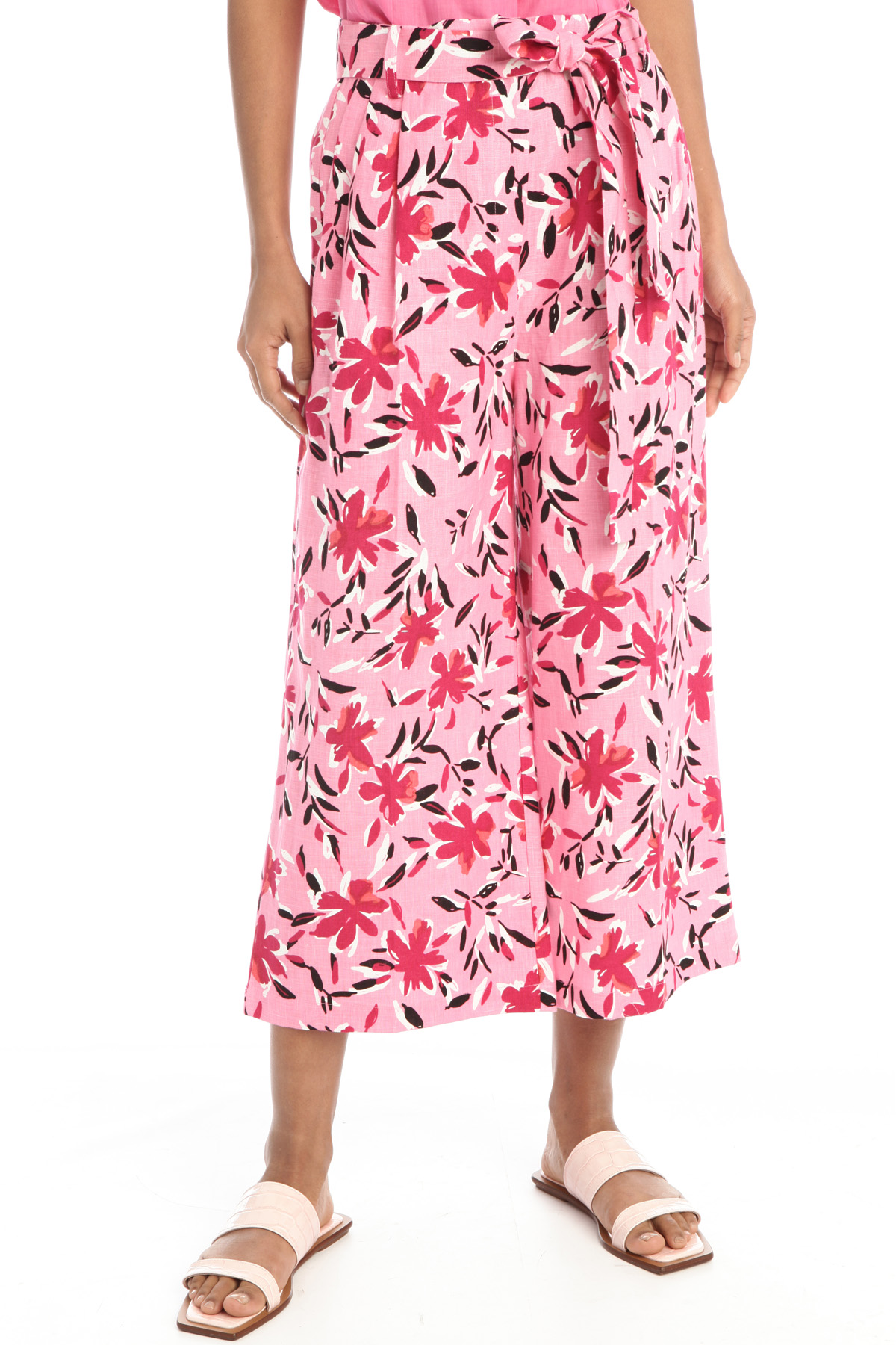 Pantaloni cropped dalla linea ampia realizzati in puro lino, con pieghe in vita e tasche laterali alla francese. Allacciatura nascosta con zip, bottone e gancio. Capo dotato di cintura coordinata.