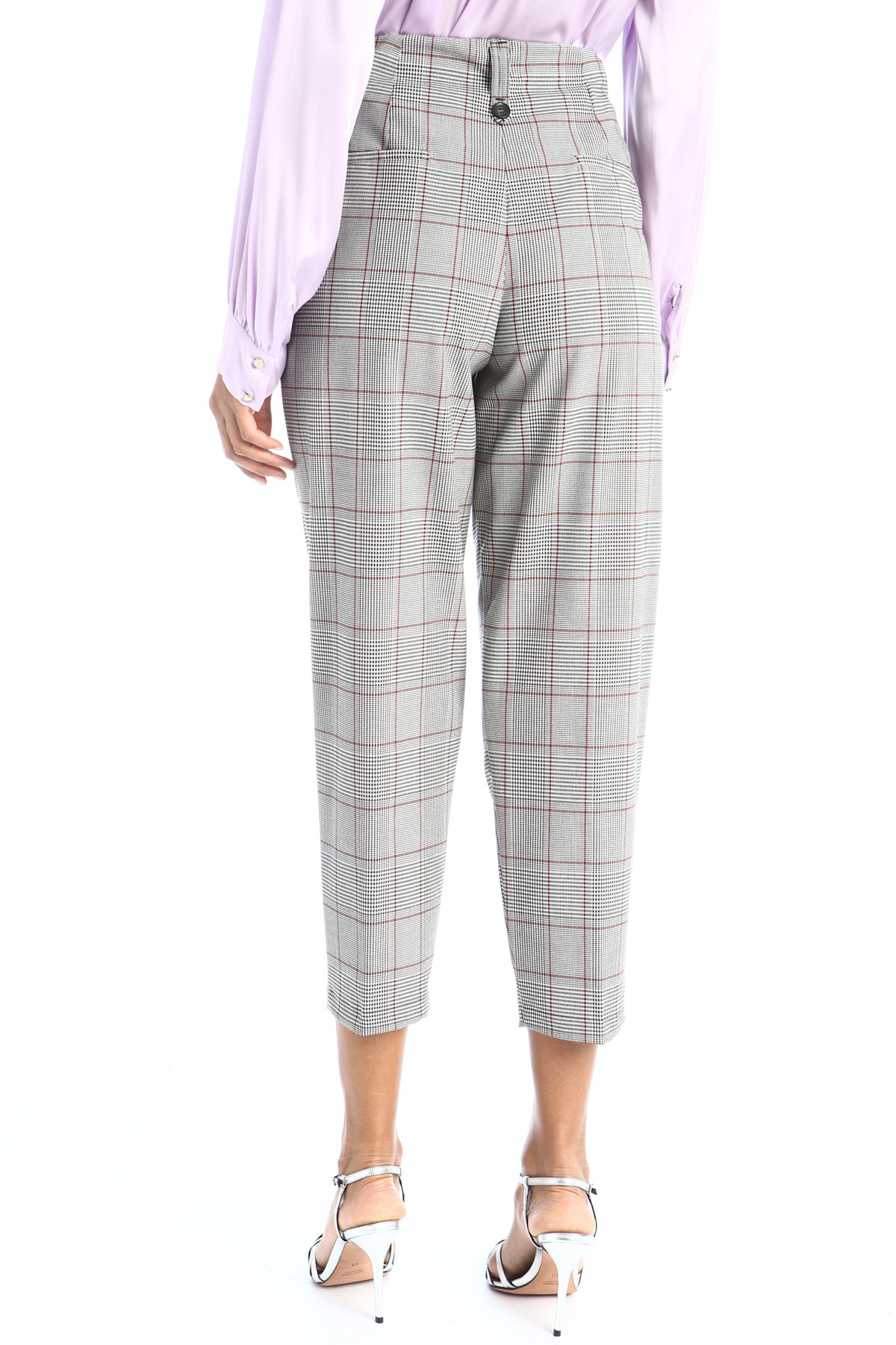Pantaloni carrot realizzati in tela fluida stretch, con lavorazione tinto filo, tasche laterali inserite nella cucitura e a filetto dietro. Allacciatura nascosta tramite zip e bottone.