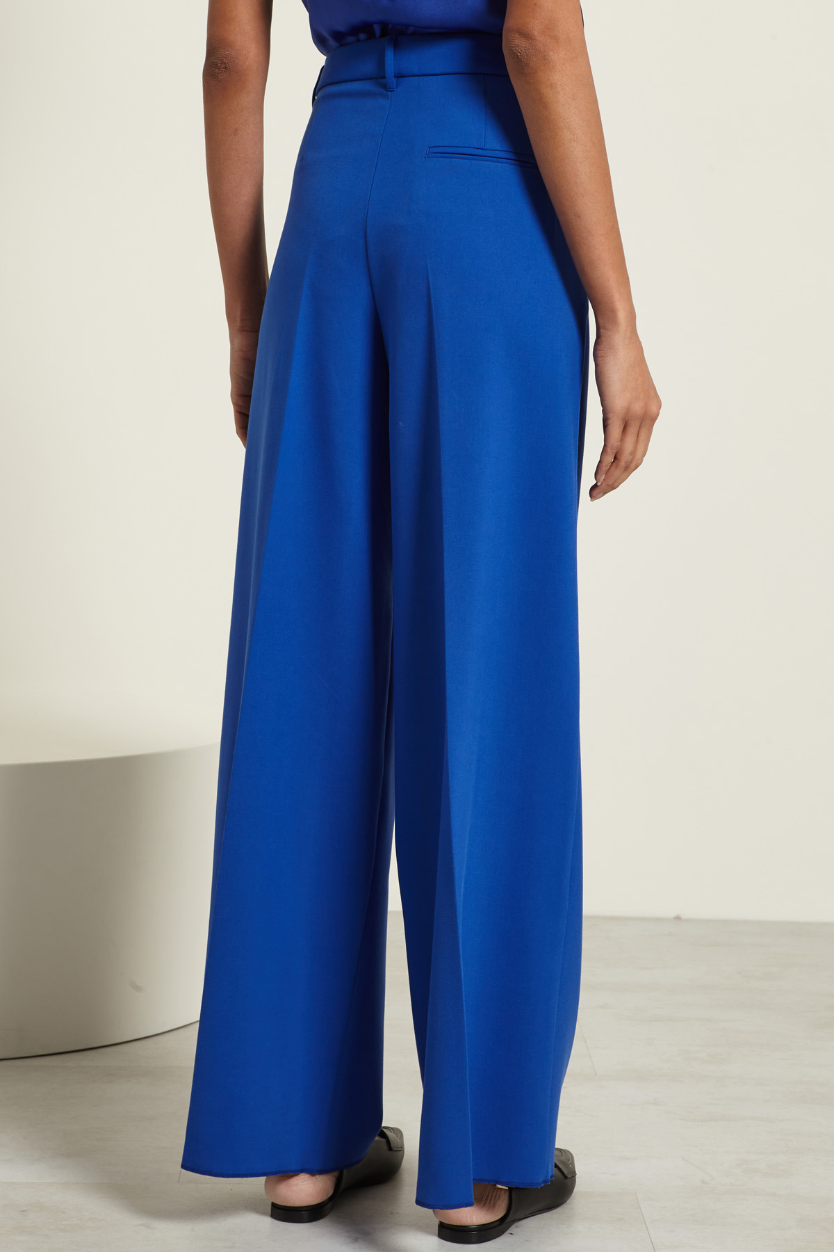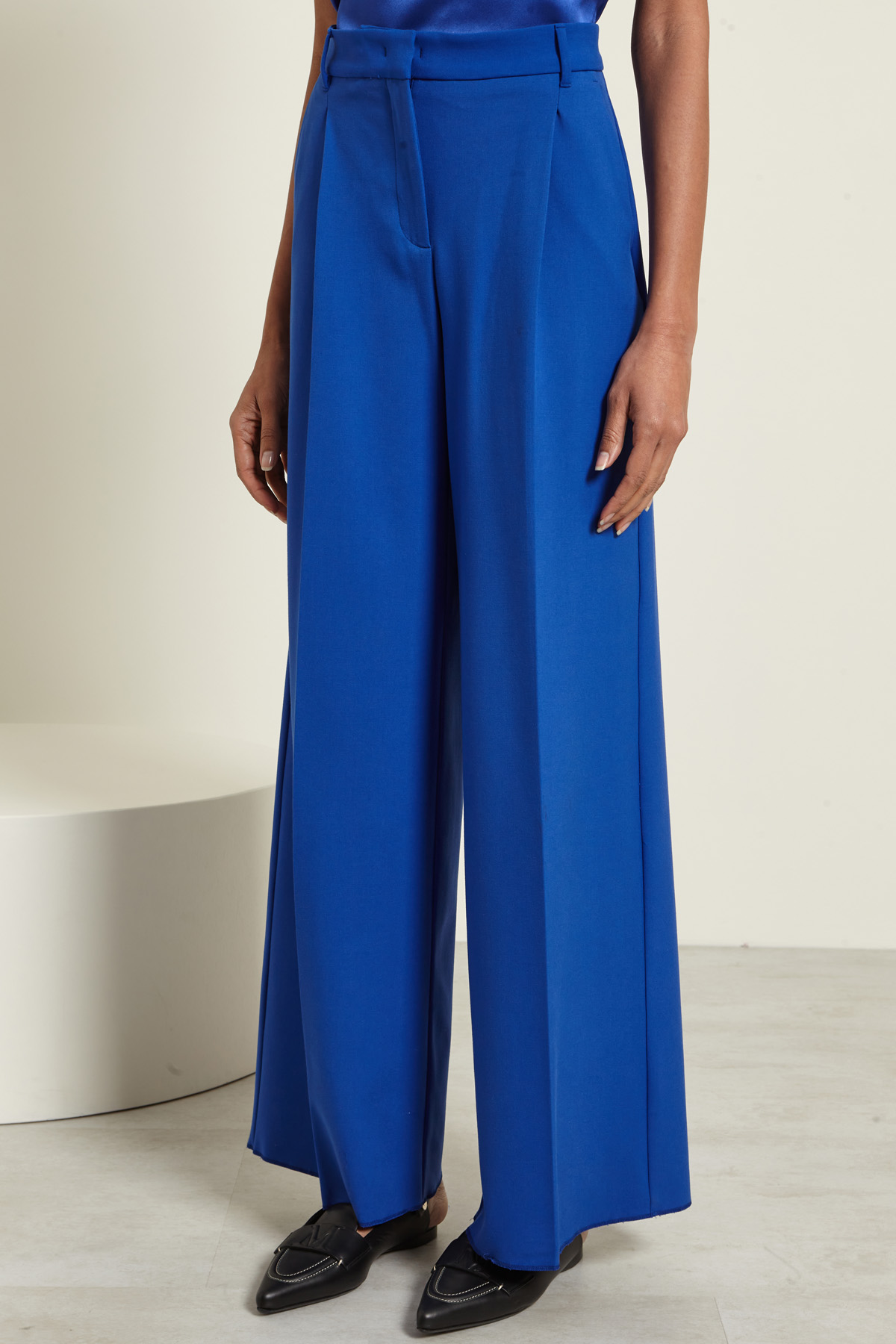 Pantaloni a palazzo dalla linea ampia realizzati in gabardina di misto viscosa stretch, con passanti e pieghe cucite in vita, piega stirata, tasche alla francese davanti e a doppio filetto dietro. Allacciatura nascosta tramite zip, bottone e gancio.