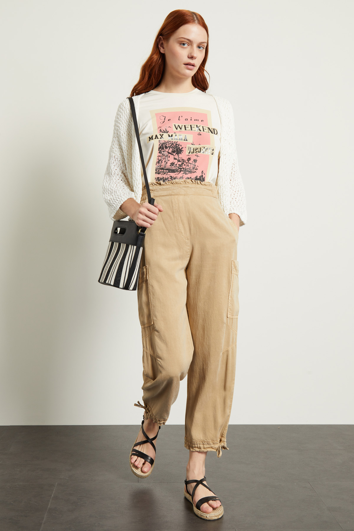 Pantaloni stile joggers realizzati in tessuto effetto seta lavata, con motivo di rouches e inserto elastico in vita, tasche laterali inserite in cucitura e applicate dietro, dettaglio di coulisse a fondo capo.
