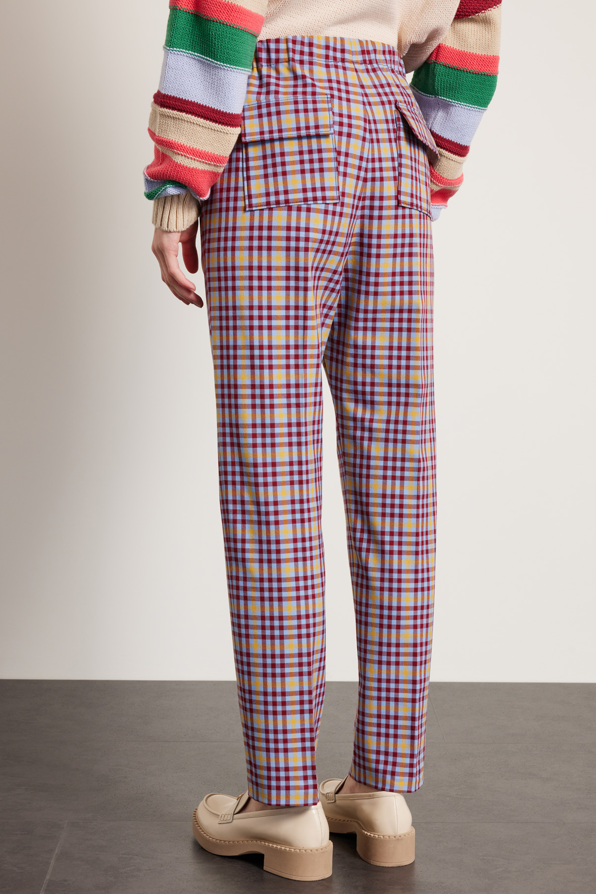 Pantaloni dalla linea regolare realizzati in tessuto diagonale di misto viscosa stretch tinto filo, con inserto elastico e coulisse in vita, tasche laterali inserite in cucitura e applicate con patta nel retro.